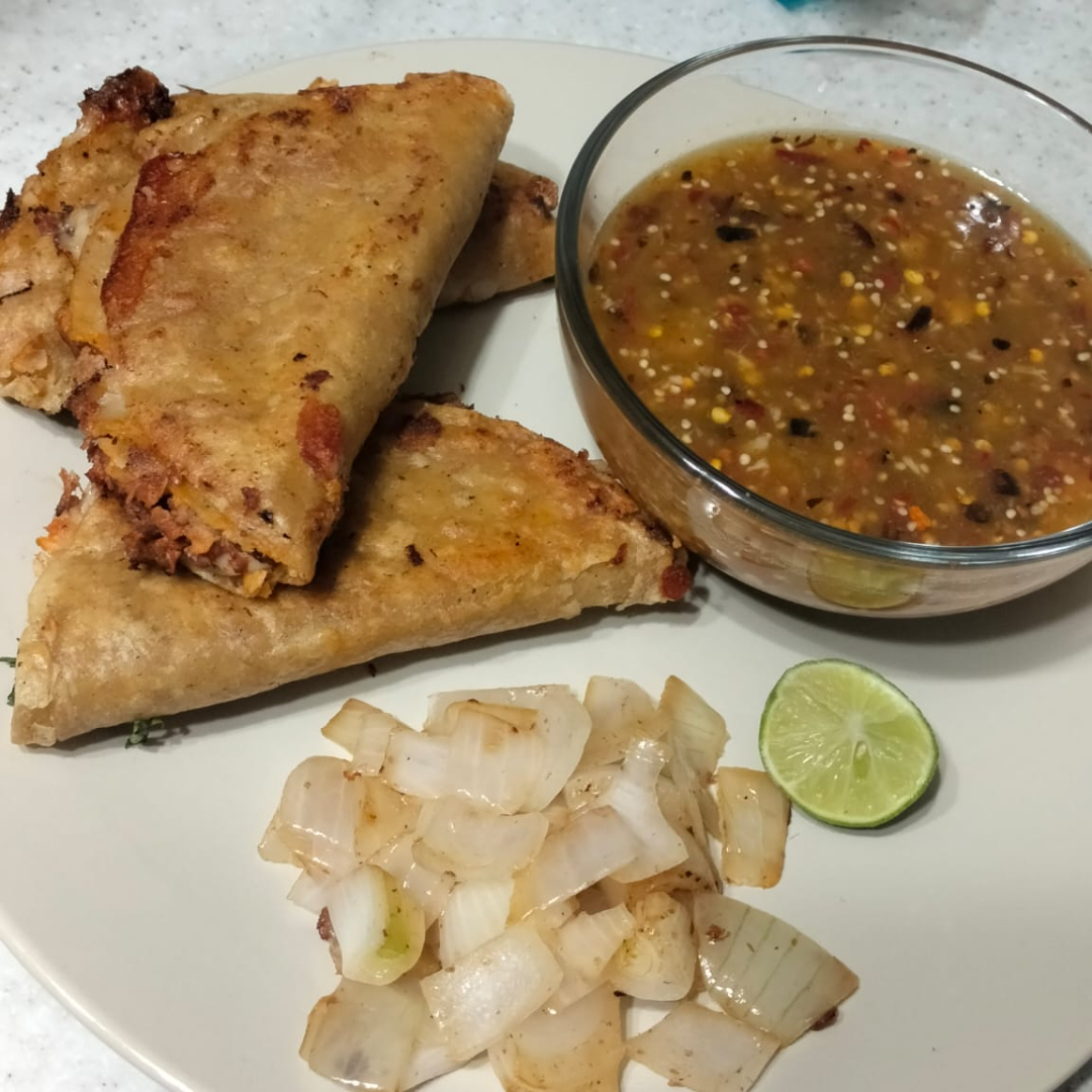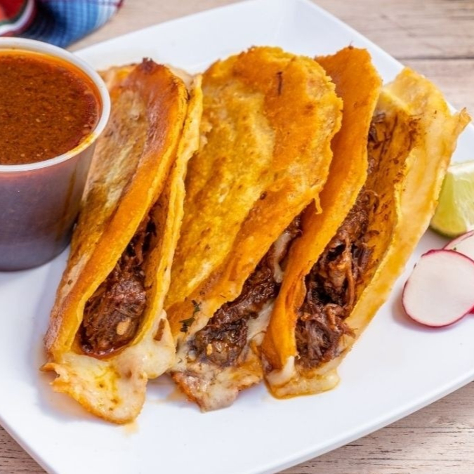 Dos tortillas de maiz doradas con birria de res y queso asadero Incluye: -cebolla y cilantro -salsa de tomatito hecha en molcajete -salsa roja -limones