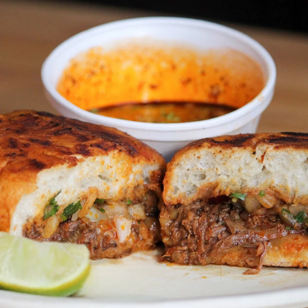 1 Bolillo con queso asadero y birria de res Incluye: -cebolla y cilantro -salsa de tomatito hecha en molcajete -salsa roja -limones