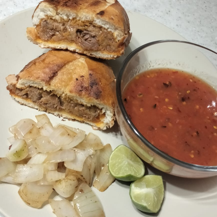 1 Bolillo con birria de res Incluye: -cebolla y cilantro -salsa de tomatito hecha en molcajete -salsa roja -limones