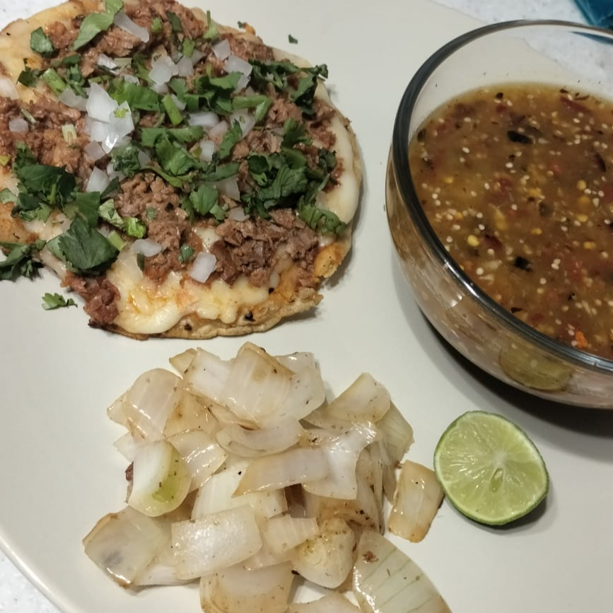 Dos tortillas de maiz doradas con birria de res Incluye: -cebolla y cilantro -salsa de tomatito hecha en molcajete -salsa roja -limones