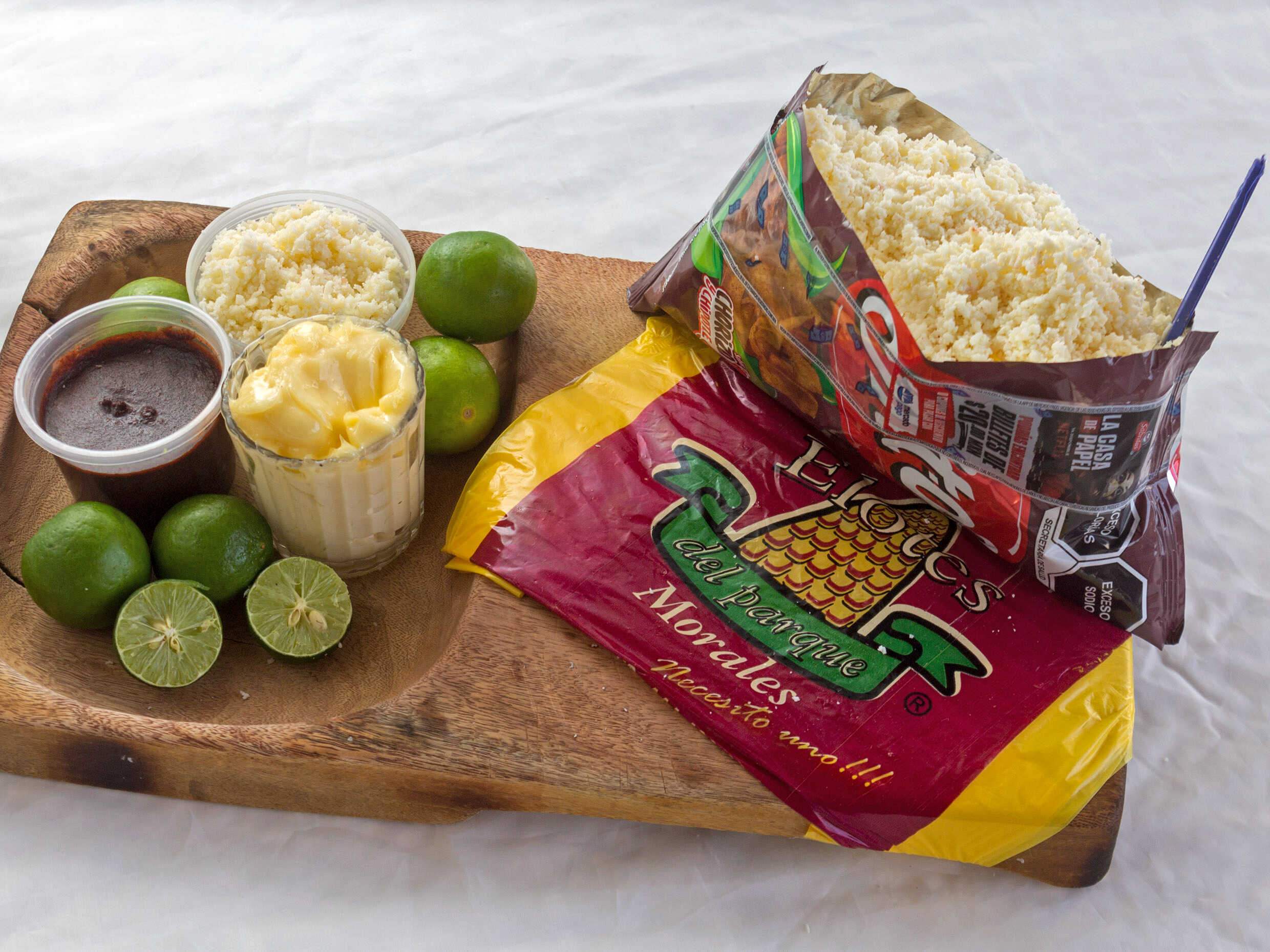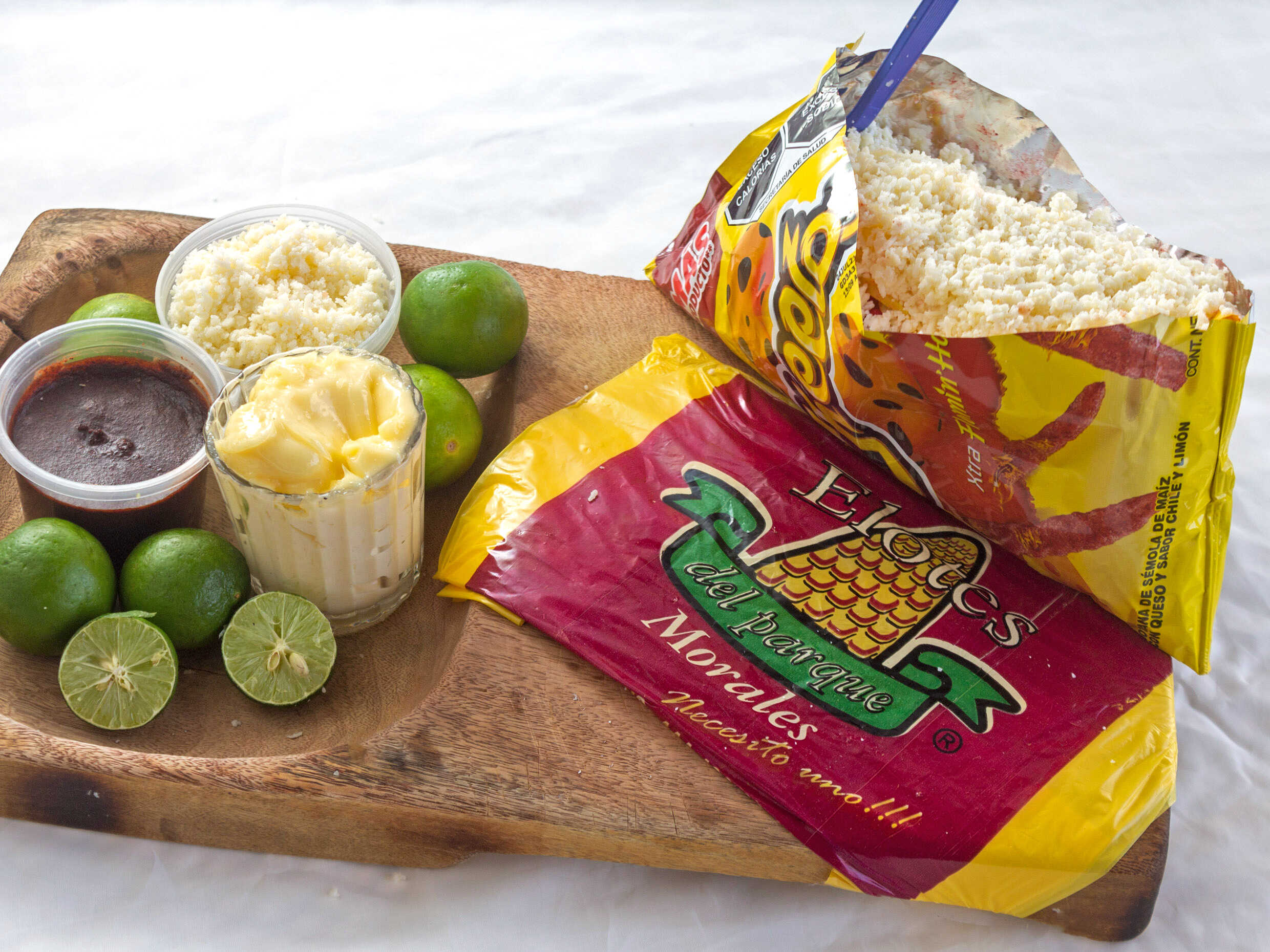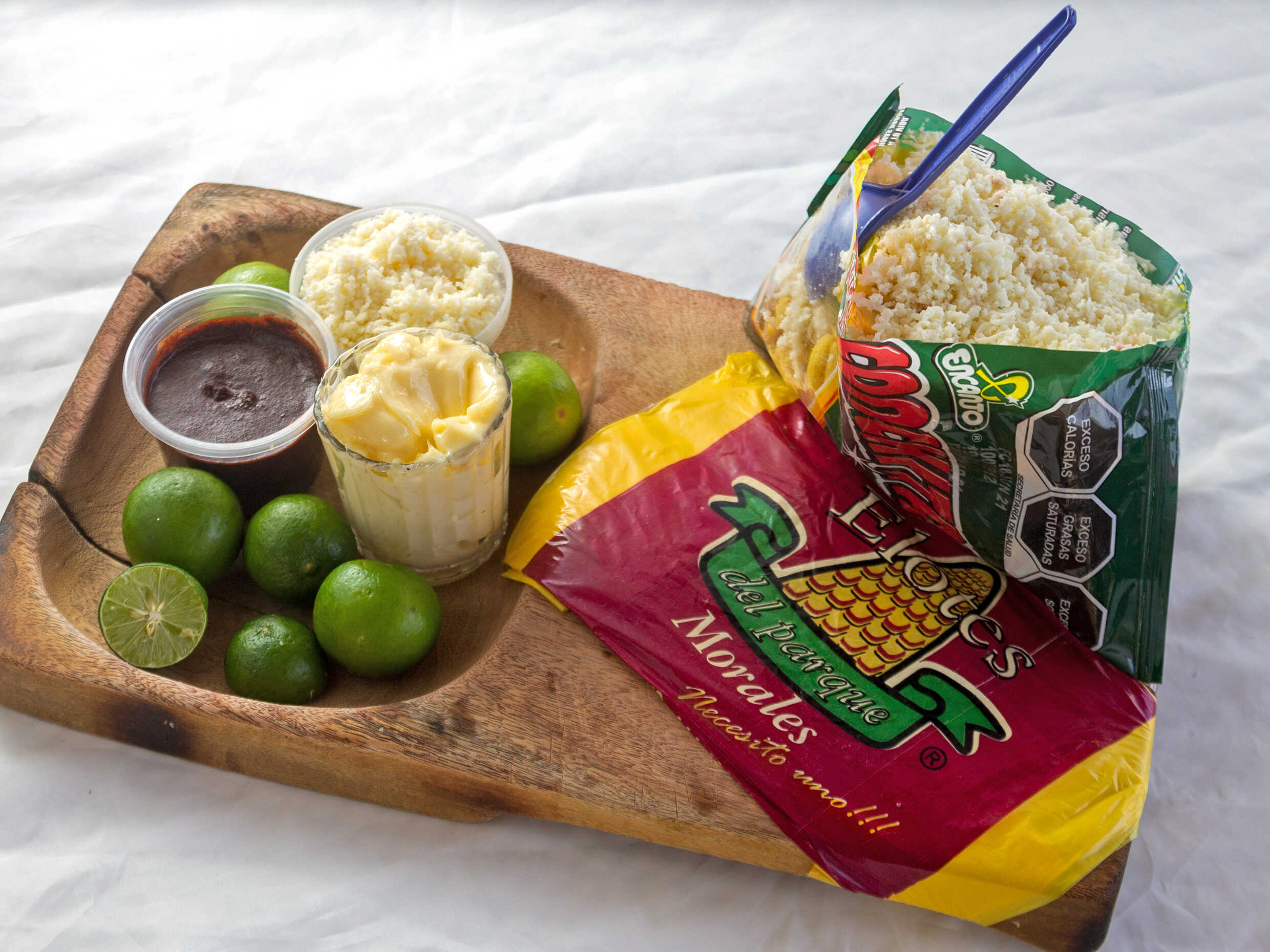 Crema, Mayonesa, Mantequilla, Chile, Limón, Queso Blanco y Elotes del Parque.
