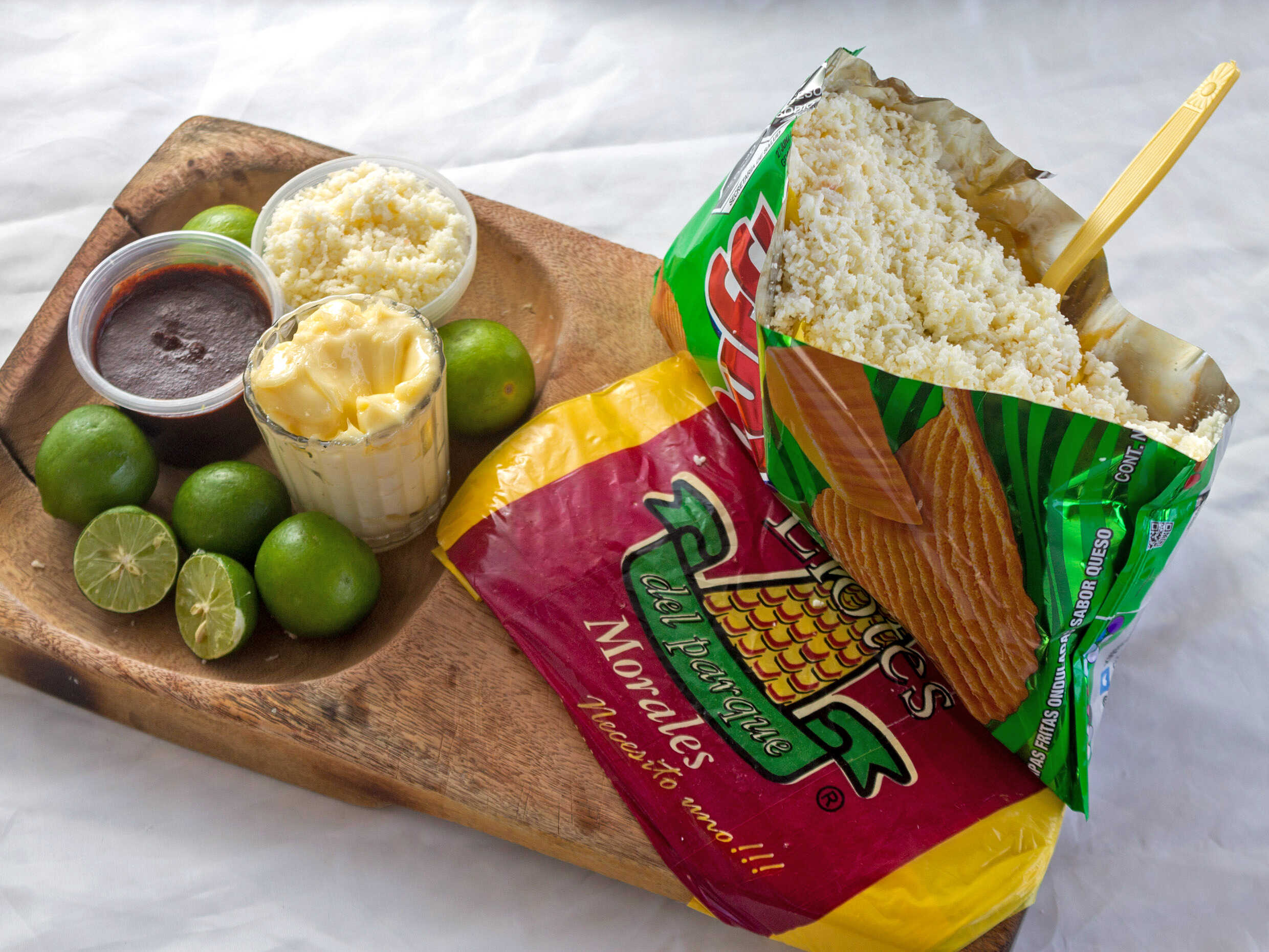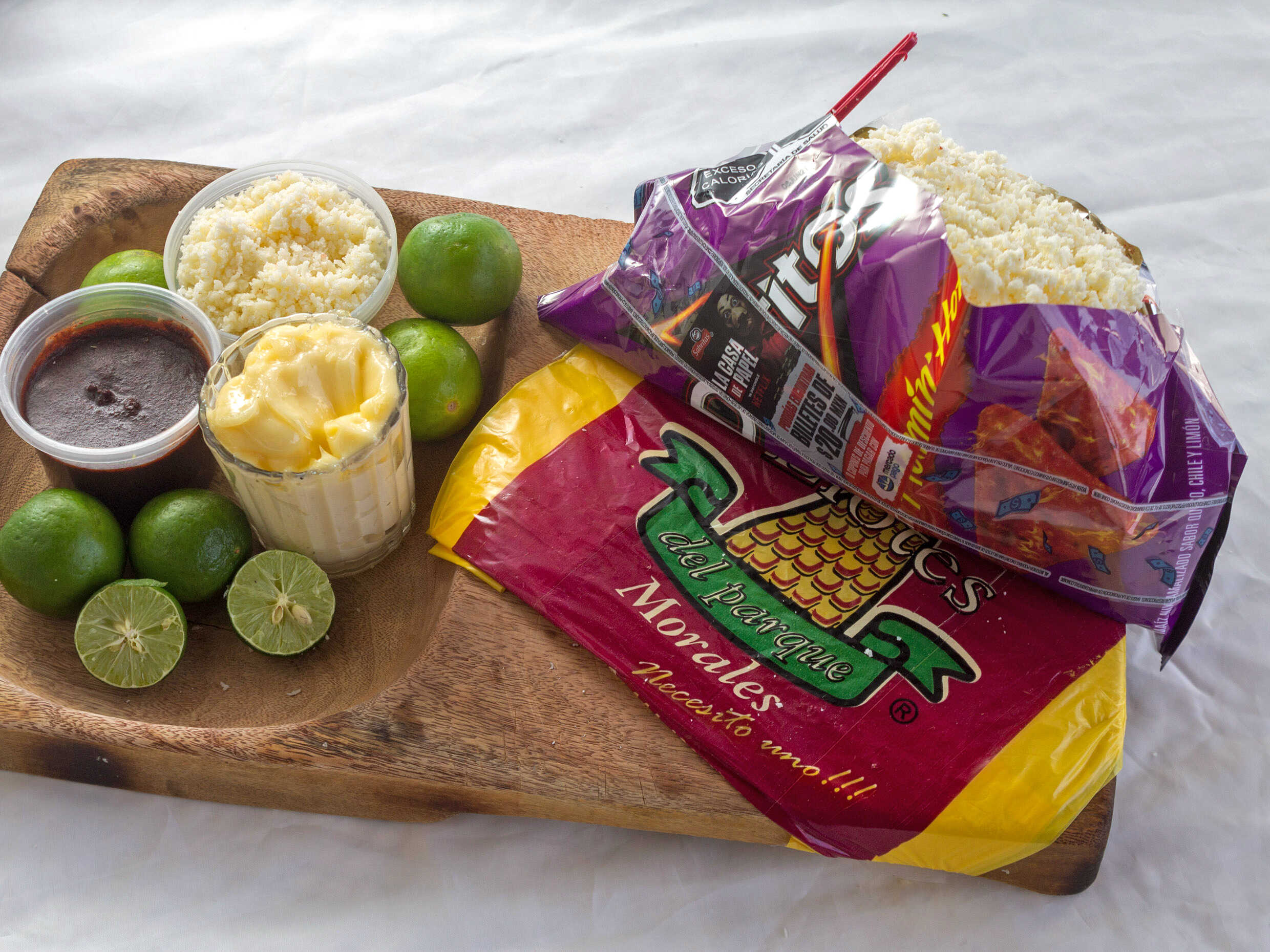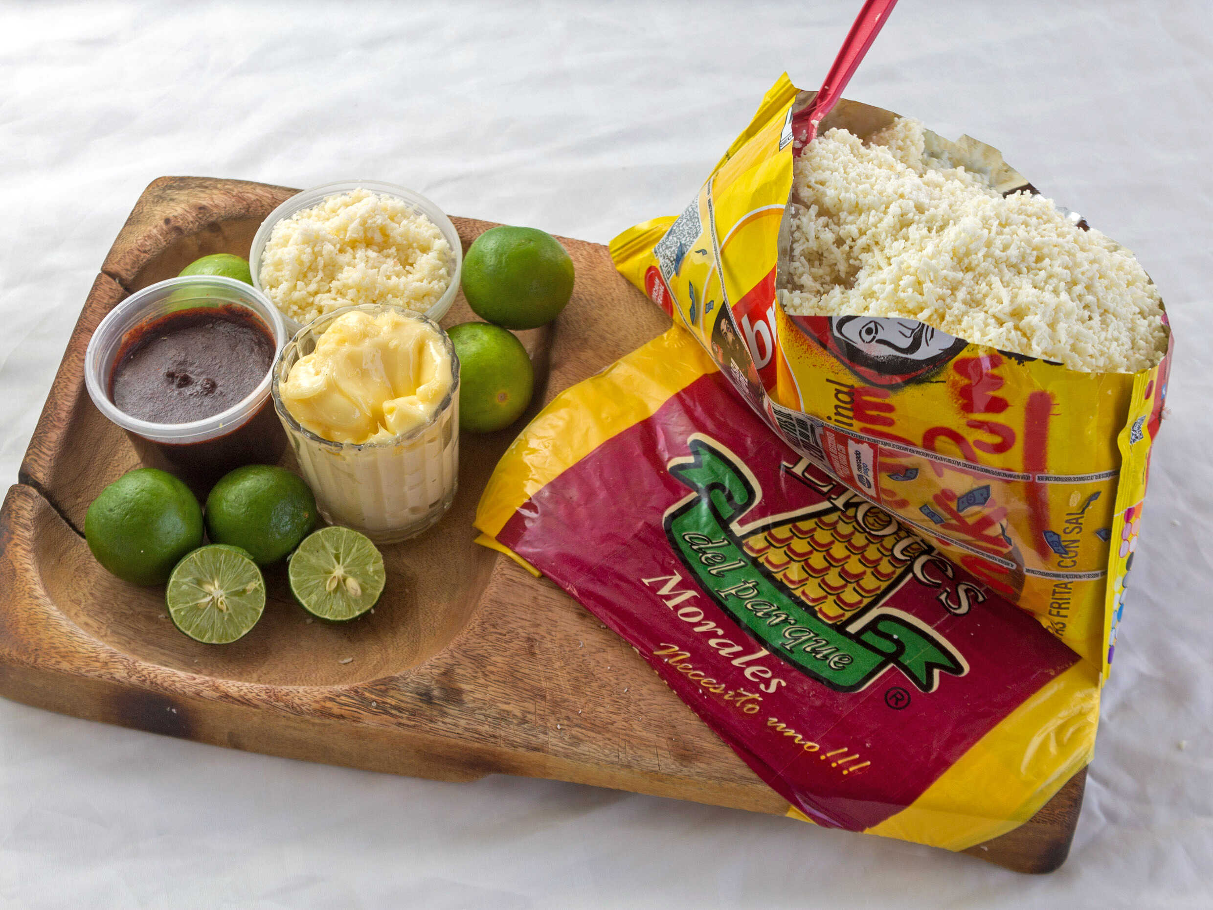 Crema, Mayonesa, Mantequilla, Chile, Limón, Queso Blanco y Elotes del Parque.