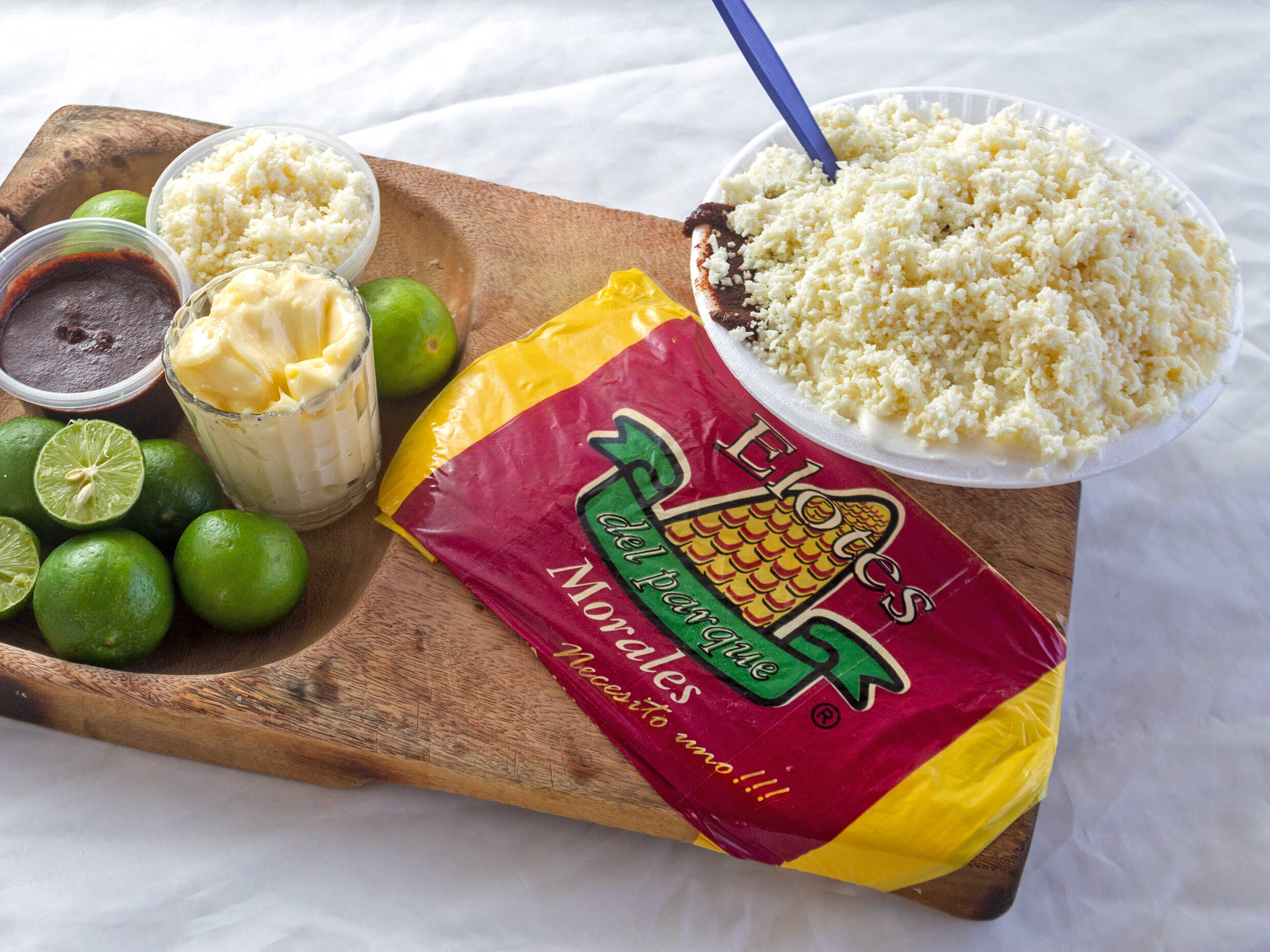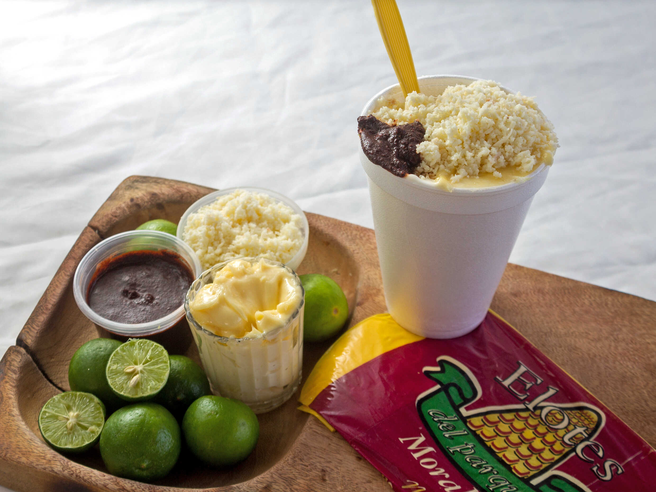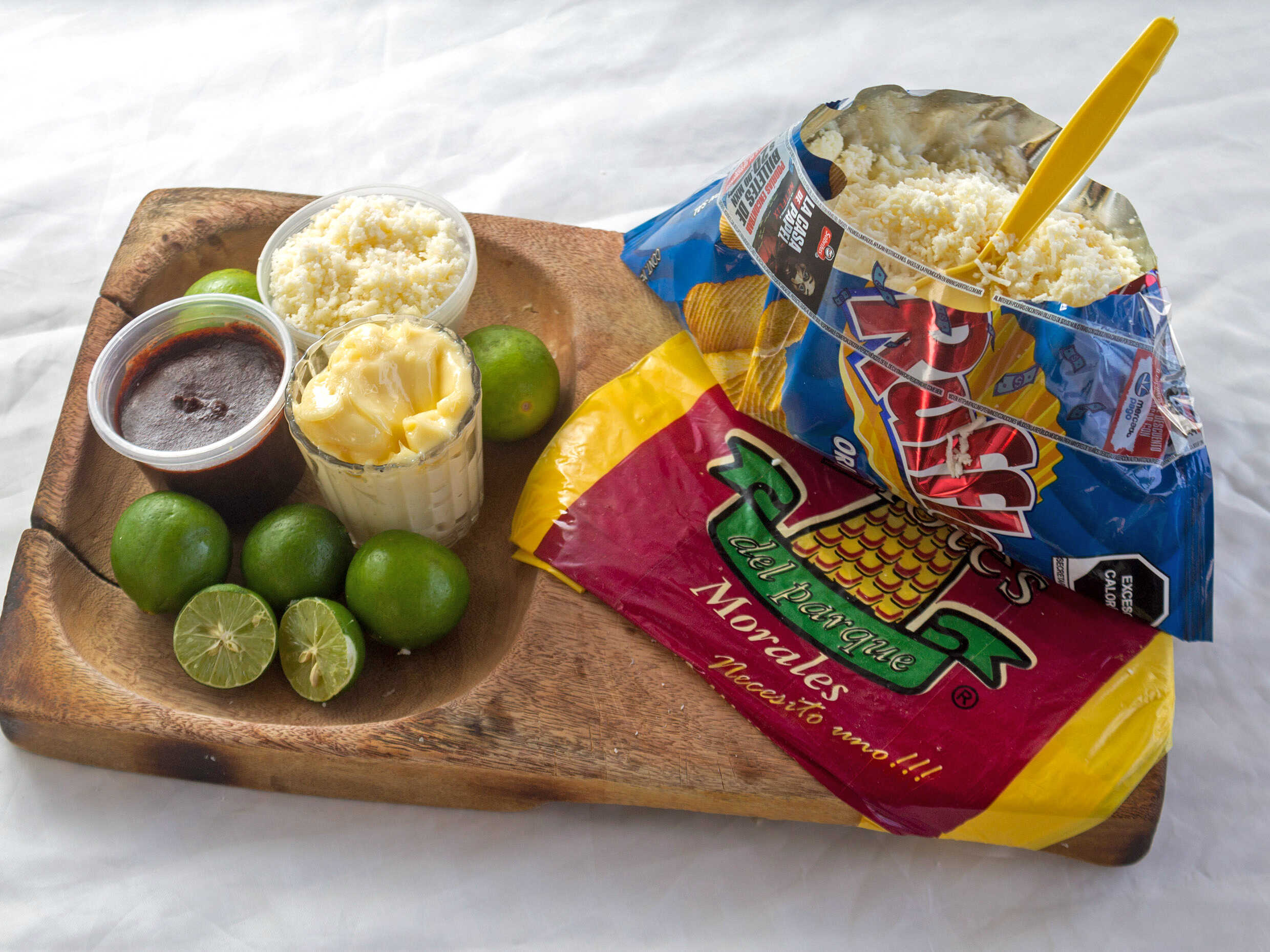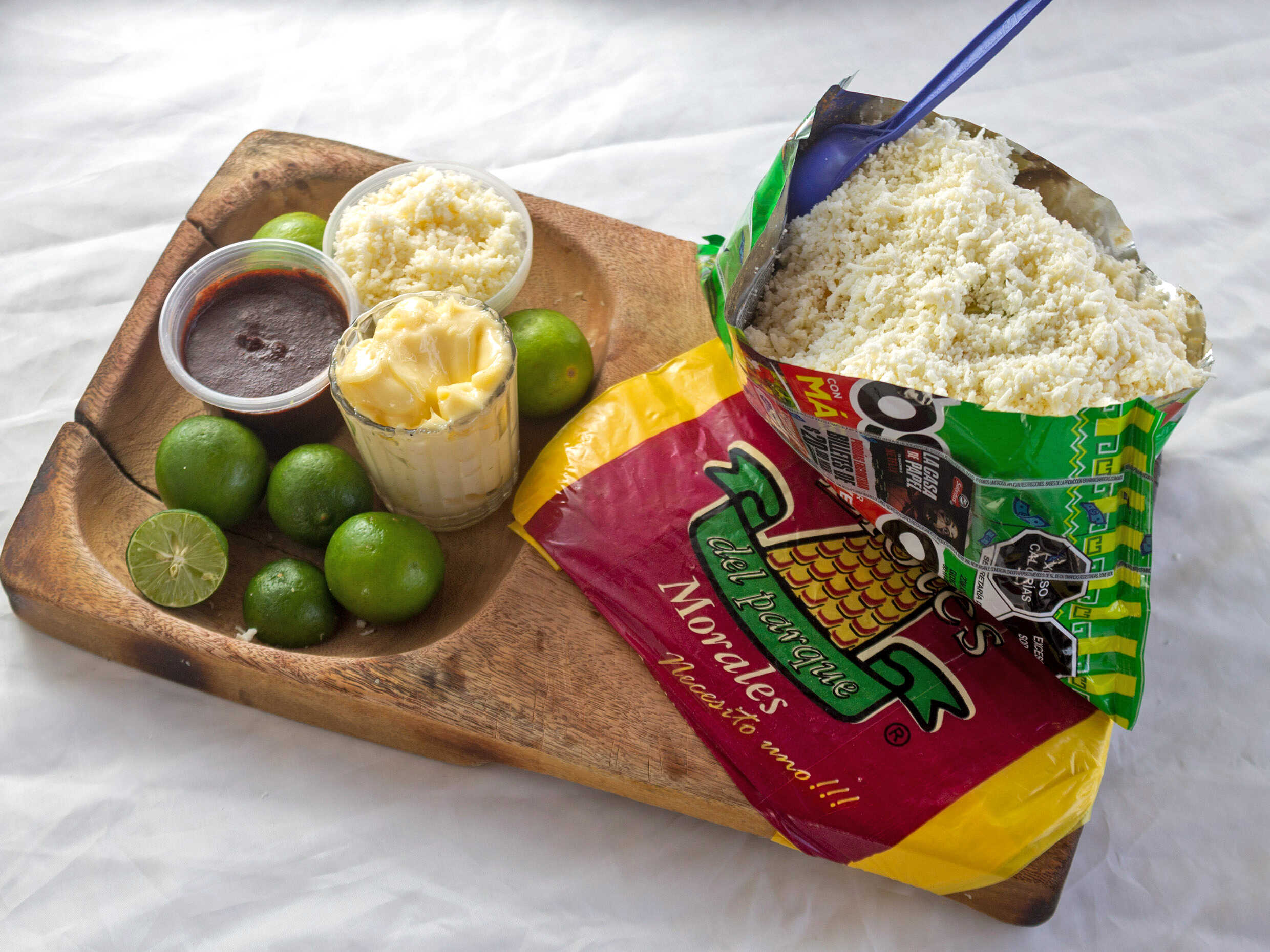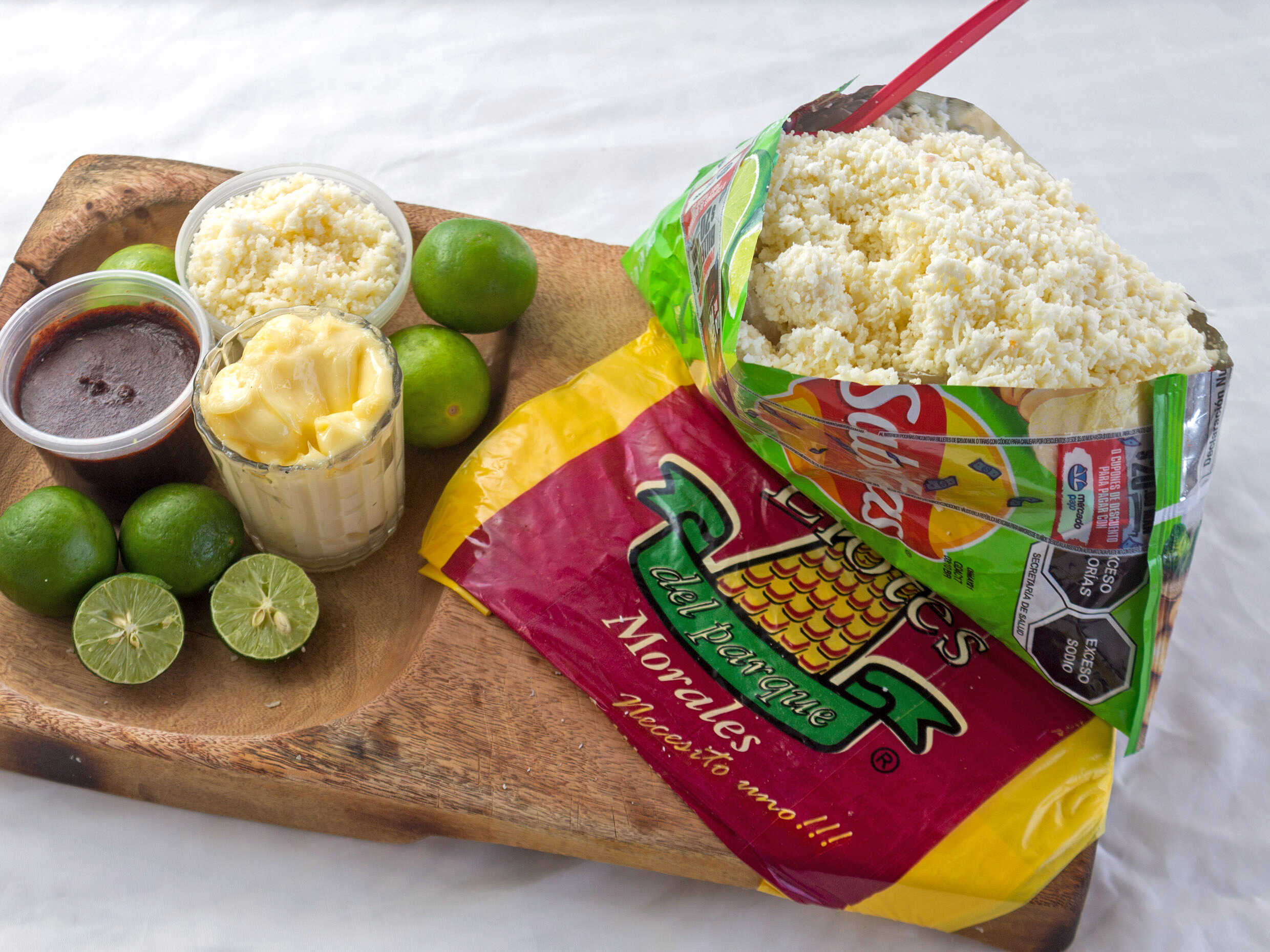 Crema, Mayonesa, Mantequilla, Chile, Limón, Queso Blanco y Elotes del Parque.