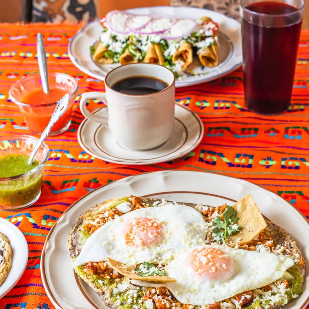 Masa de maíz con frijol negro especial, frito en manteca de cerdo, preparado con una cama de salsa, cebolla, queso fresco y 2 huevos estrellados.