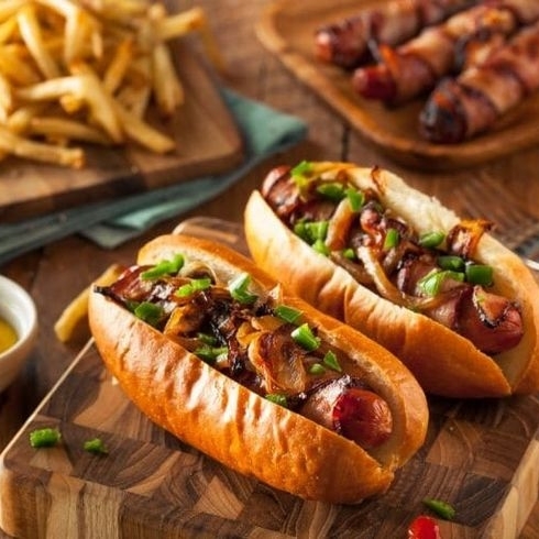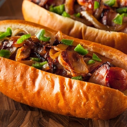 Salchicha de pavo con queso asadero y envuelta en tocino, cebolla caramelizada y aderezos.