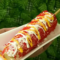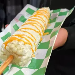 Elote entero empanizado con papas de tu elección, con mayonesa, crema, queso blanco, queso amarillo