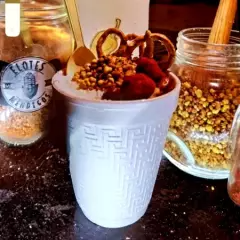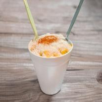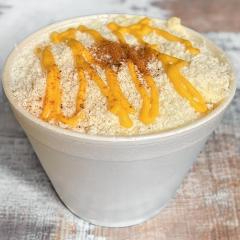 Vaso de elote desgranado con mayonesa, crema, queso blanco, queso amarillo, chile