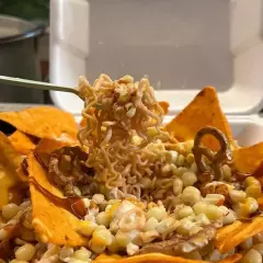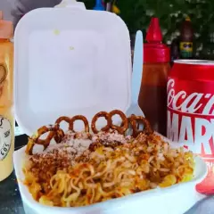 Papas de tu eleccion, maruchan de tu elección, mayonesa, crema, queso blanco, queso amarillo y chile(Porcion personal)