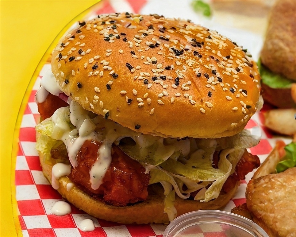 Hamburguesa de boneless de pollo bañados en salsa a elegir con lechuga, jitomate, cebolla, pepinillos y papas a la francesa