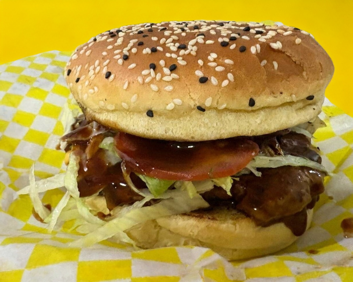 Carne de receta secreta bañada en salsa BBQ con queso amarillo, jamón, jitomate, cebolla, pepinillo, lechuga, cebolla caramelizada y papas a la francesa