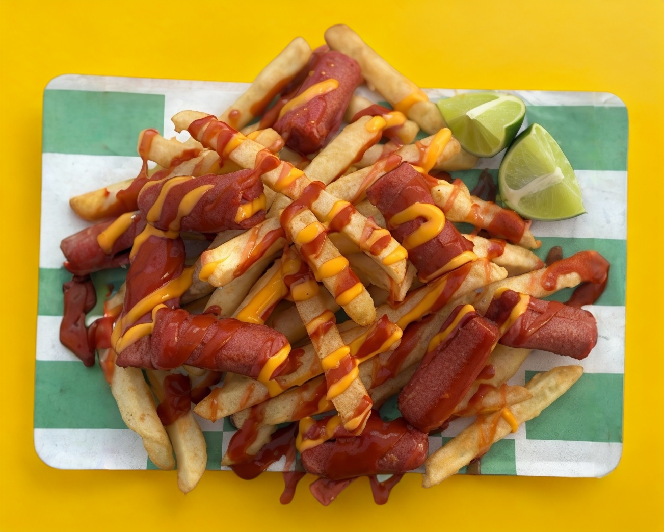 Papas fritas y salchicha frita acompañadas de queso amarillo, catsup y salsa picante
