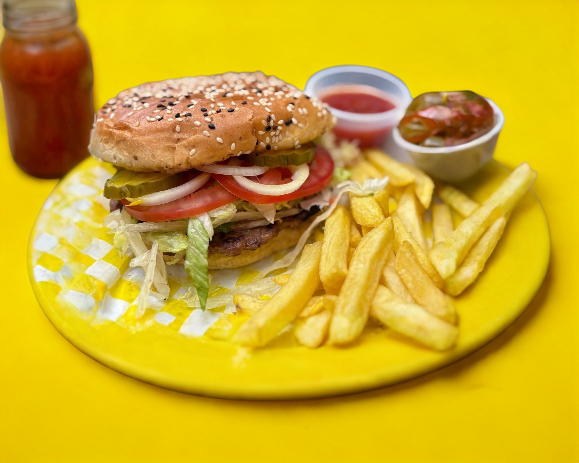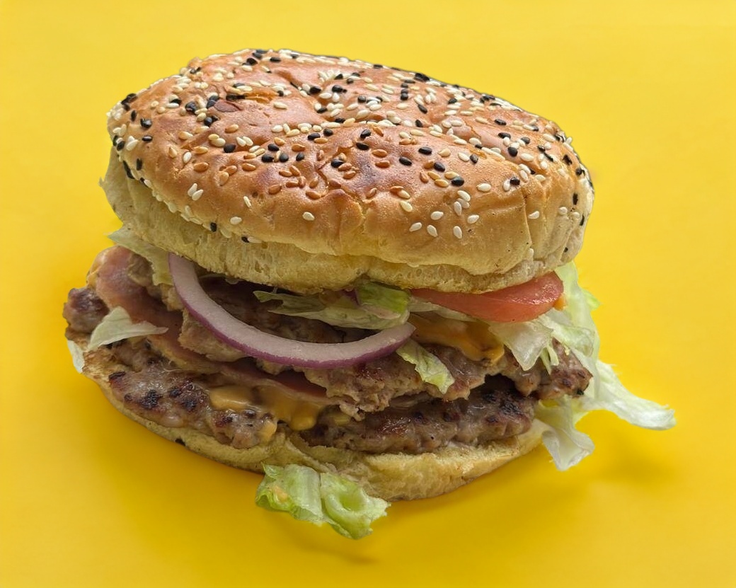 Hamburguesa doble carne con tocino, queso asadero, lechuga, cebolla, jitomate, pepinillos, catsup y papas a la francesa