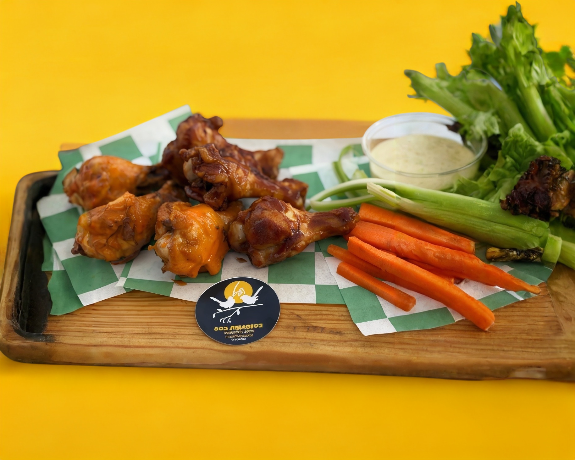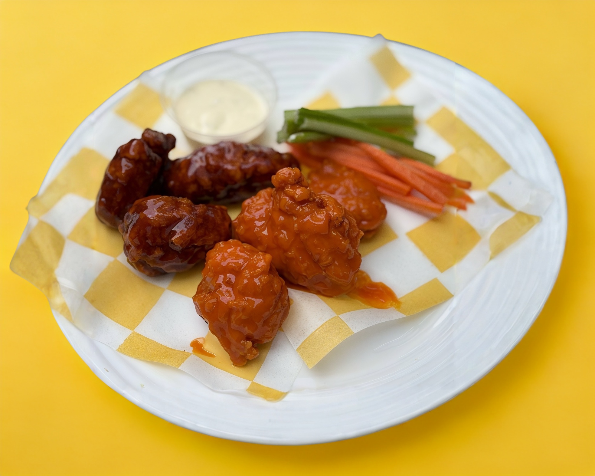 6 piezas de alitas bañadas en 1 salsa y acompañadas de aderezo, zanahoria y apio