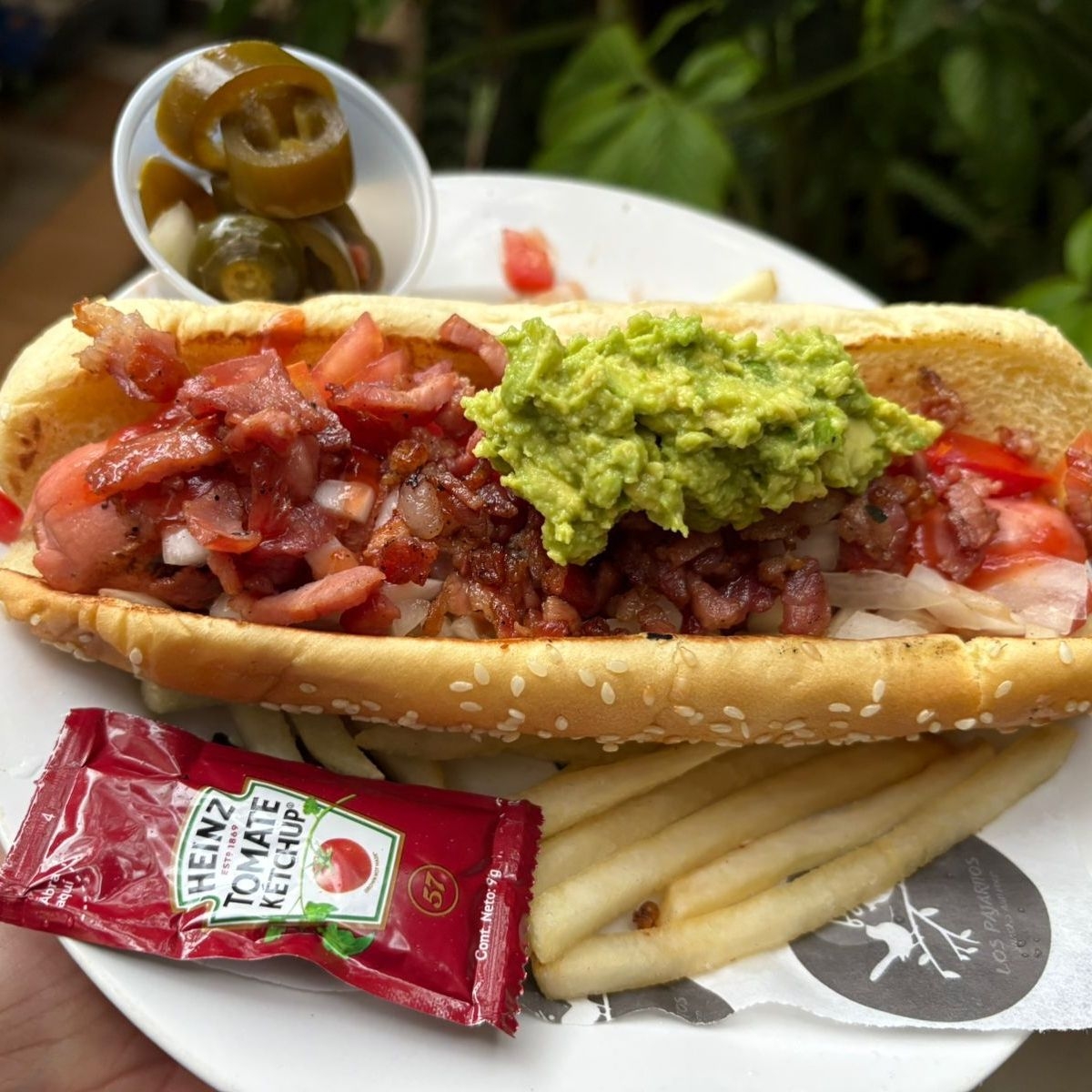 Hotdog con costra de queso, tocino y guacamole