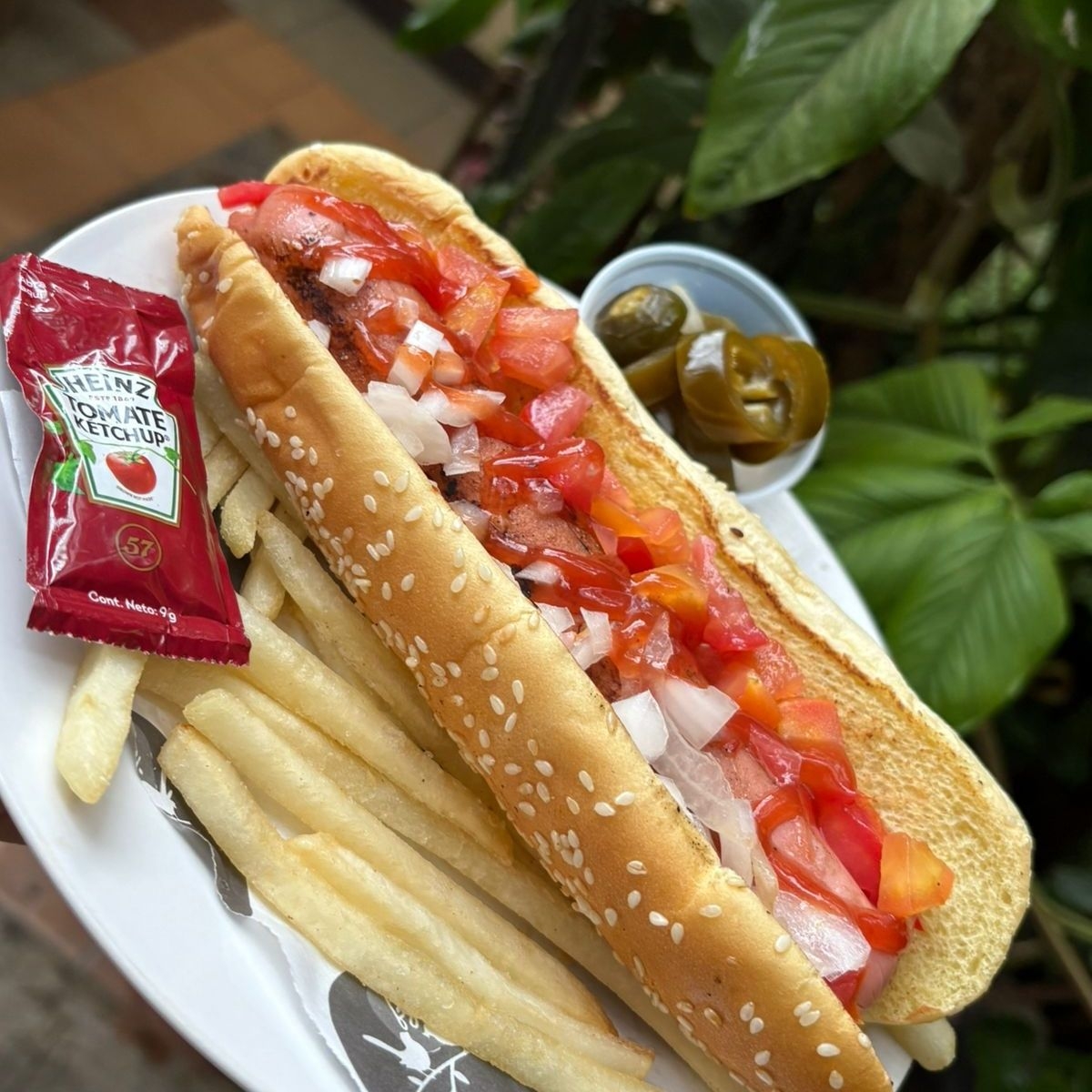 Carne de receta secreta, queso amarillo, jamón, jitomate, cebolla, pepinillo y lechuga, acompañada de papas a la francesa