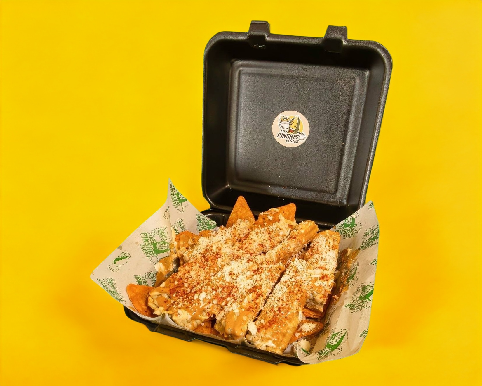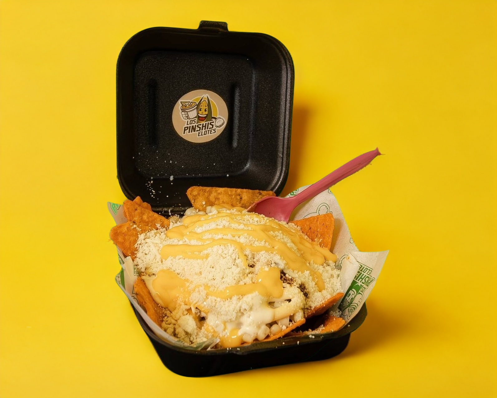Capa de sabritas a tu elección con granos de elote y rebanadas de elote preparadas con crema, mayonesa, chile, aderezo agridulce de chipotle y queso blanco.