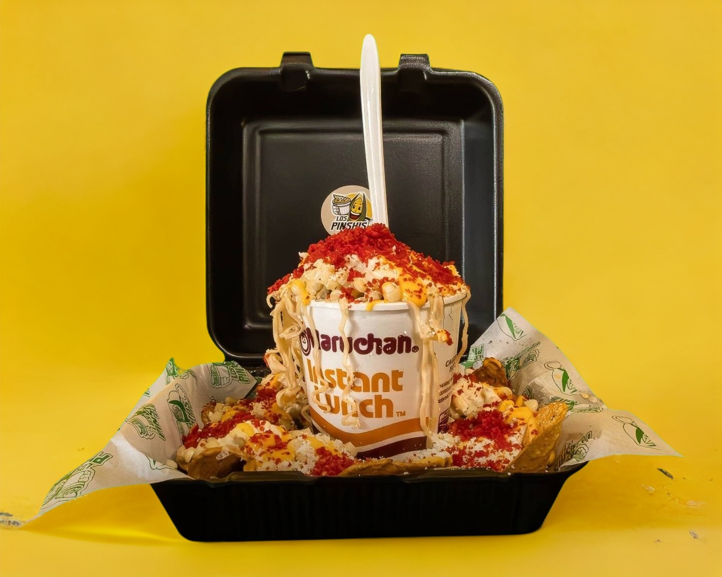 Sopa Maruchan con una capa de sabritas a elegir, con elote en grano preparado con crema, mayonesa chile, queso amarillo y queso blanco.