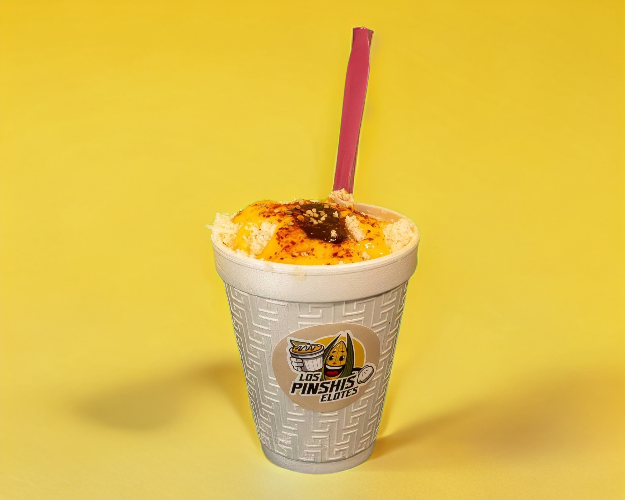 Elote en vaso preparado con mayonesa, crema, chile y queso blanco y queso amarillo.