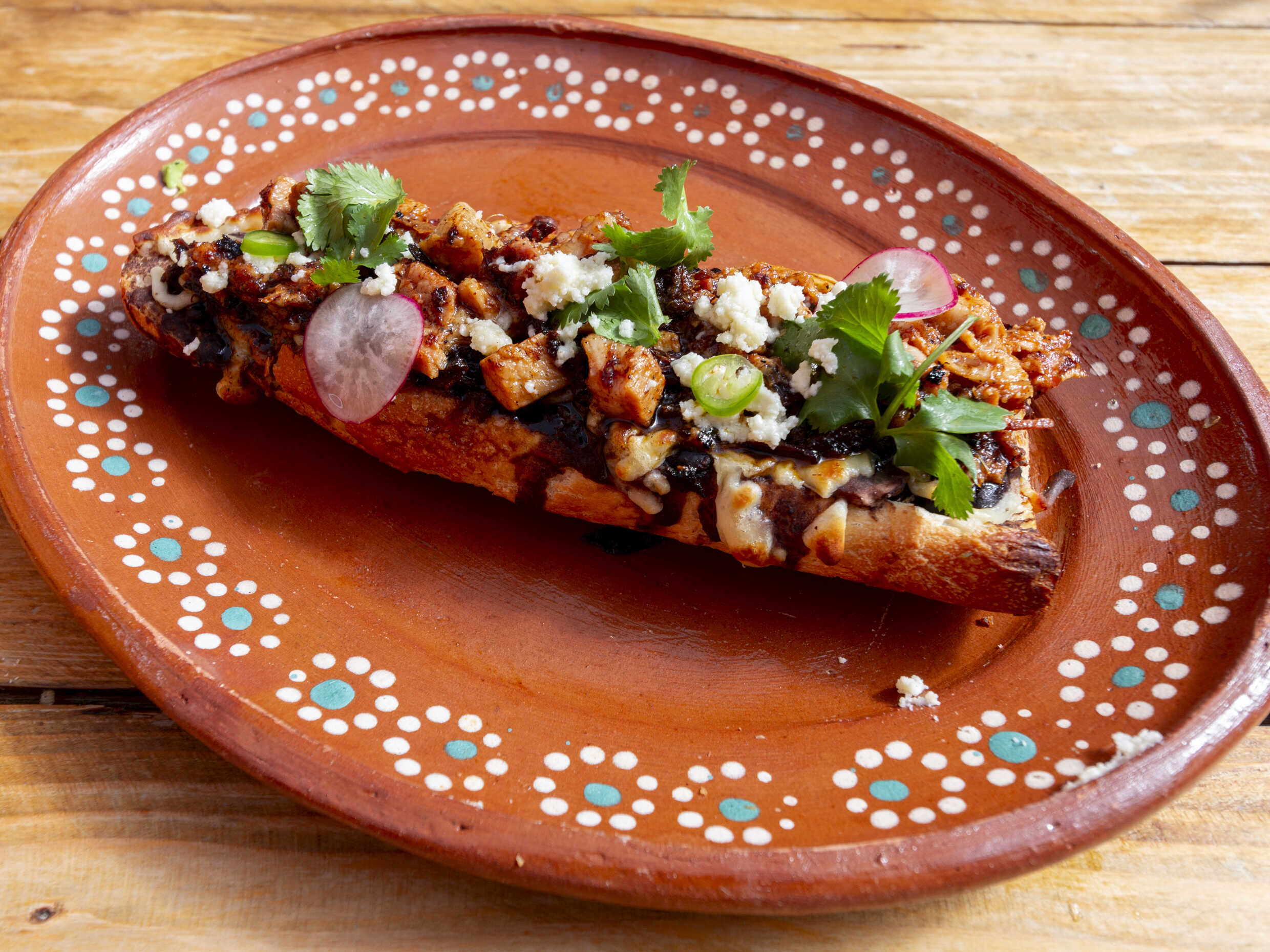 Bolillo doradito relleno de birria jugosa.