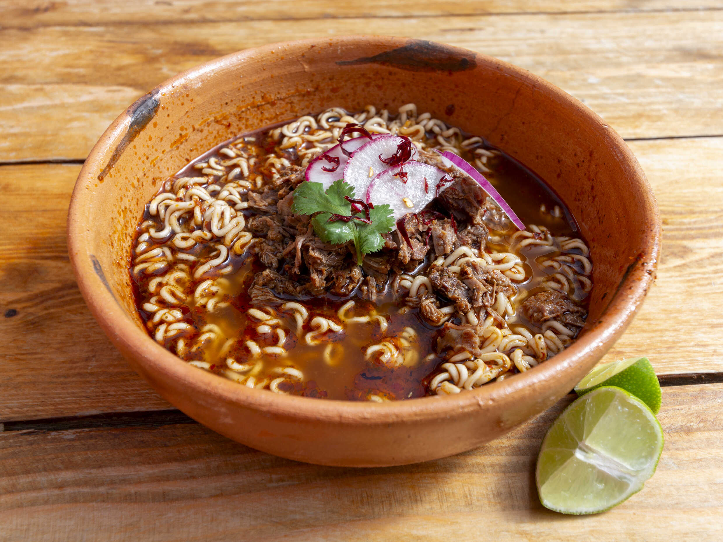 Fideos en consomé con birria y salsa de chile morita.