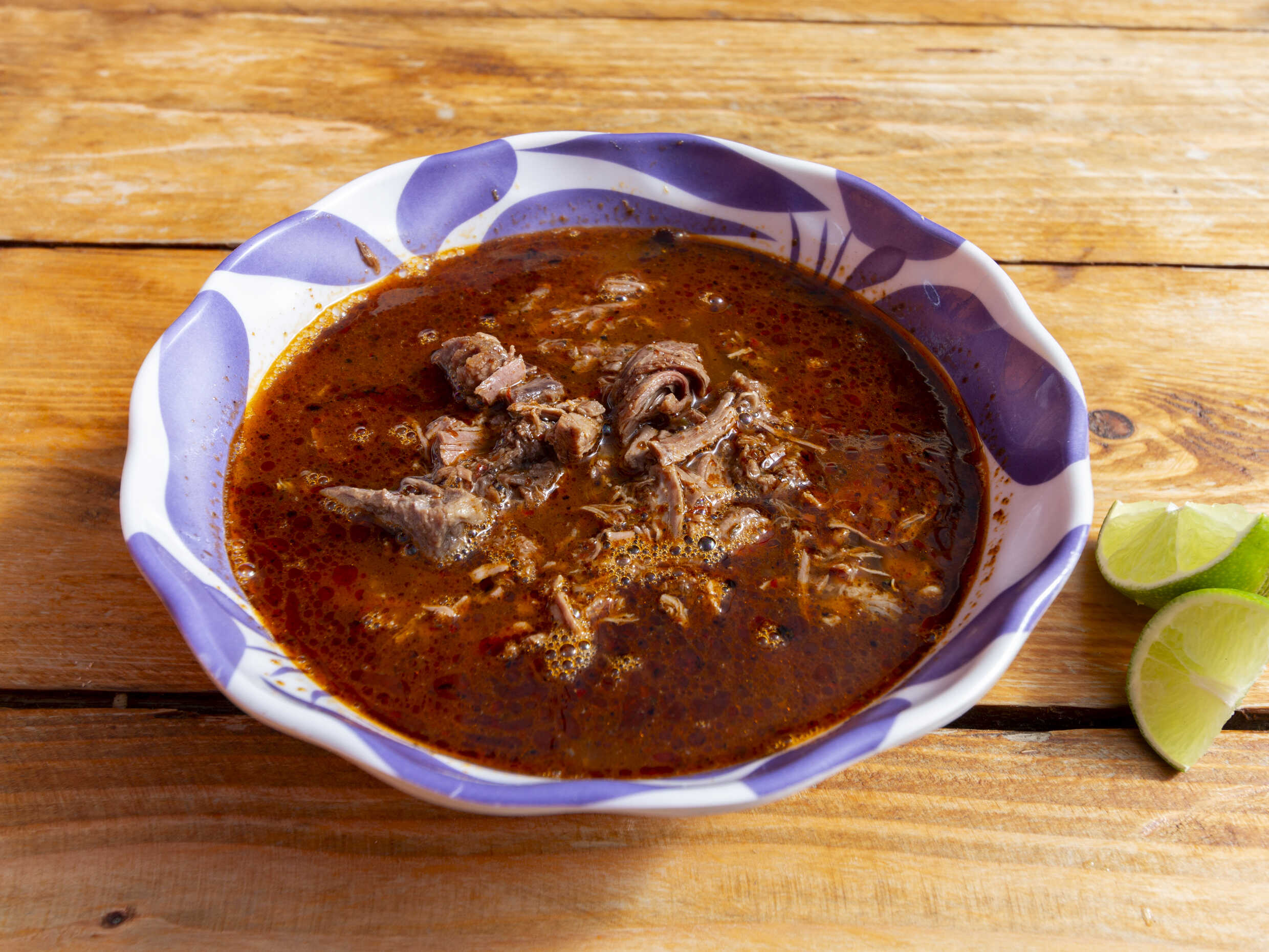 Birria con consomé acompañada con tortillas y complementos.