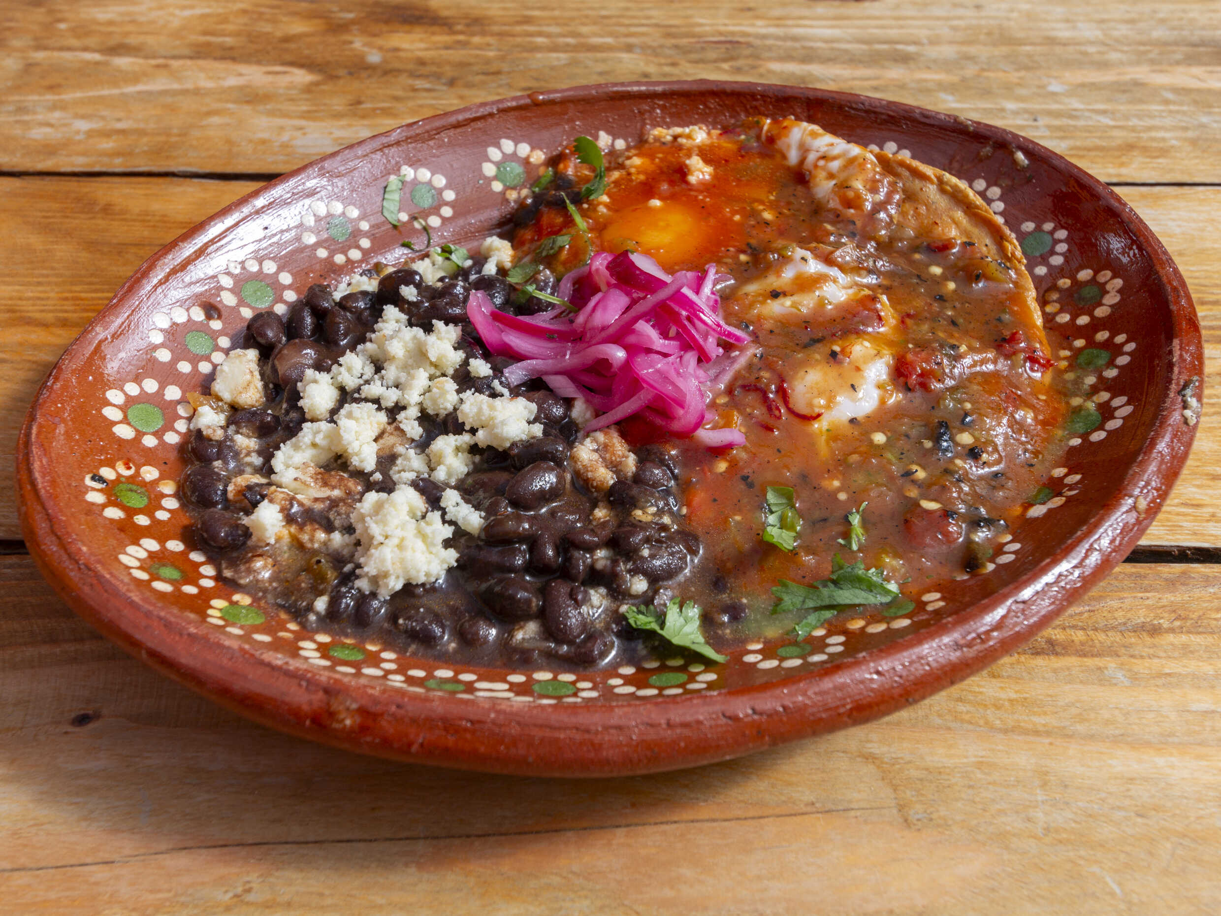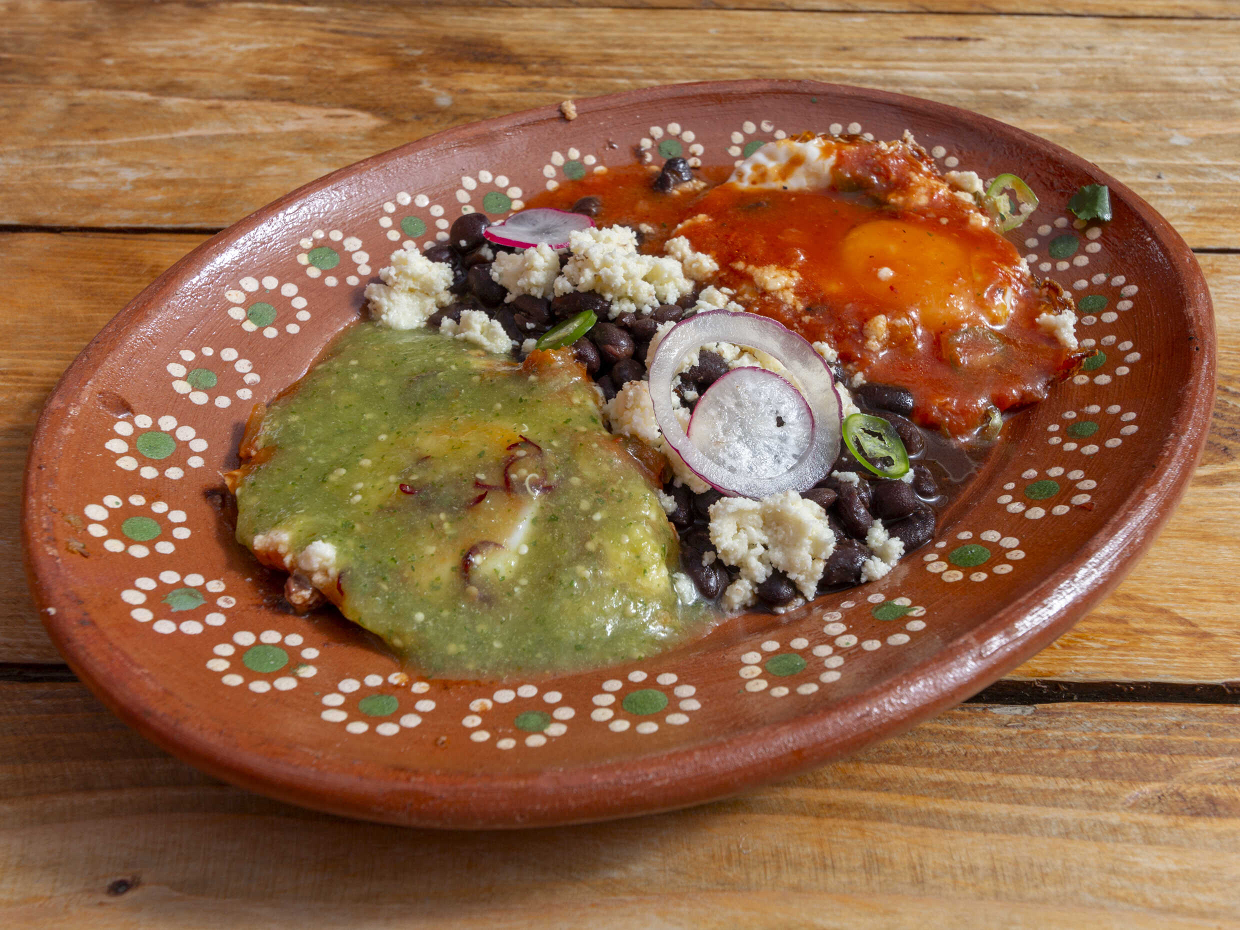 Con dos huevos estrellados encima; bañados en salsa rustica, sobre base de frijoles refritos
