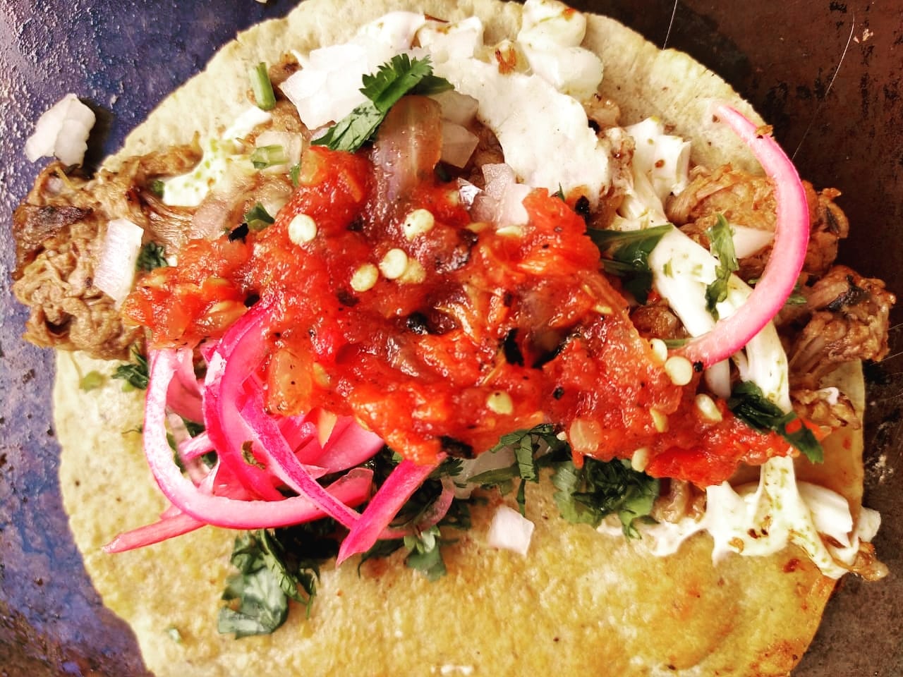Tortilla de maíz con birria jugosita.