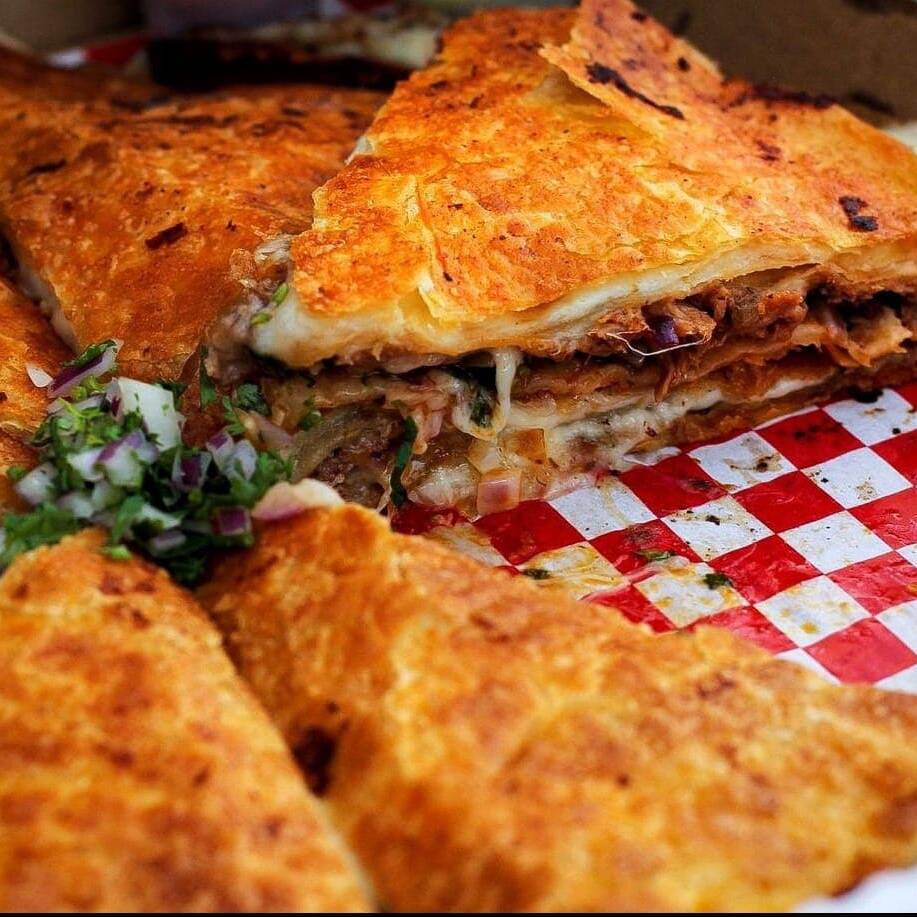 3 Capas de tortilla de harina, queso asadero y birria estilo Tijuana (tamaño mediana).