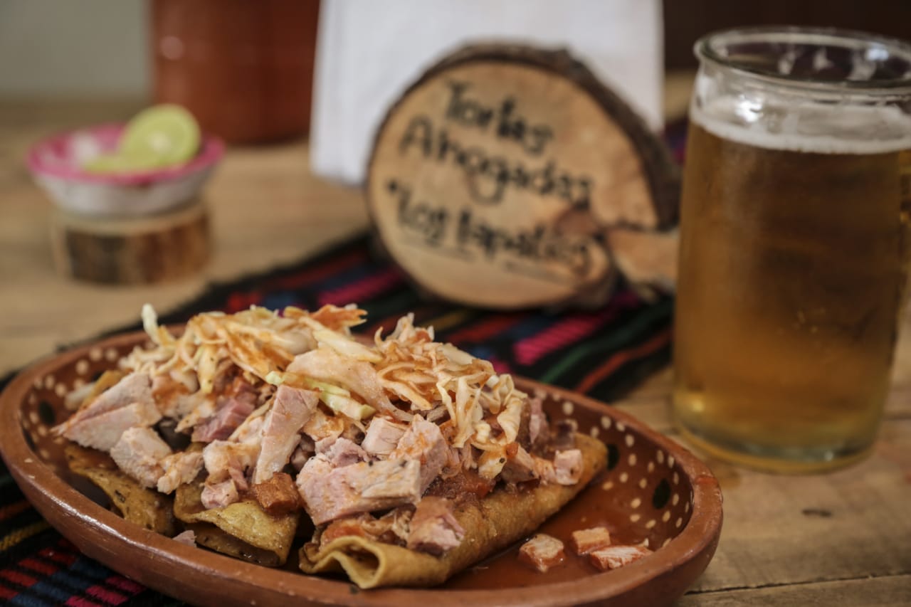 Taco dorado relleno de papa, frijol o requesón con carnitas encima. Se envía parte verdura, salsa picante y salsa dulce.