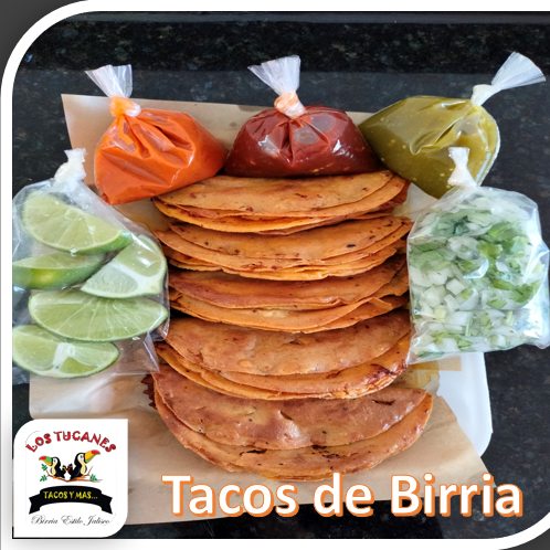 Incluye 5 Tacos de Birria Dorados o Suaves + 1 Consomé Ch Gratis! Acompañado con Verduras, Salsas y Limones.