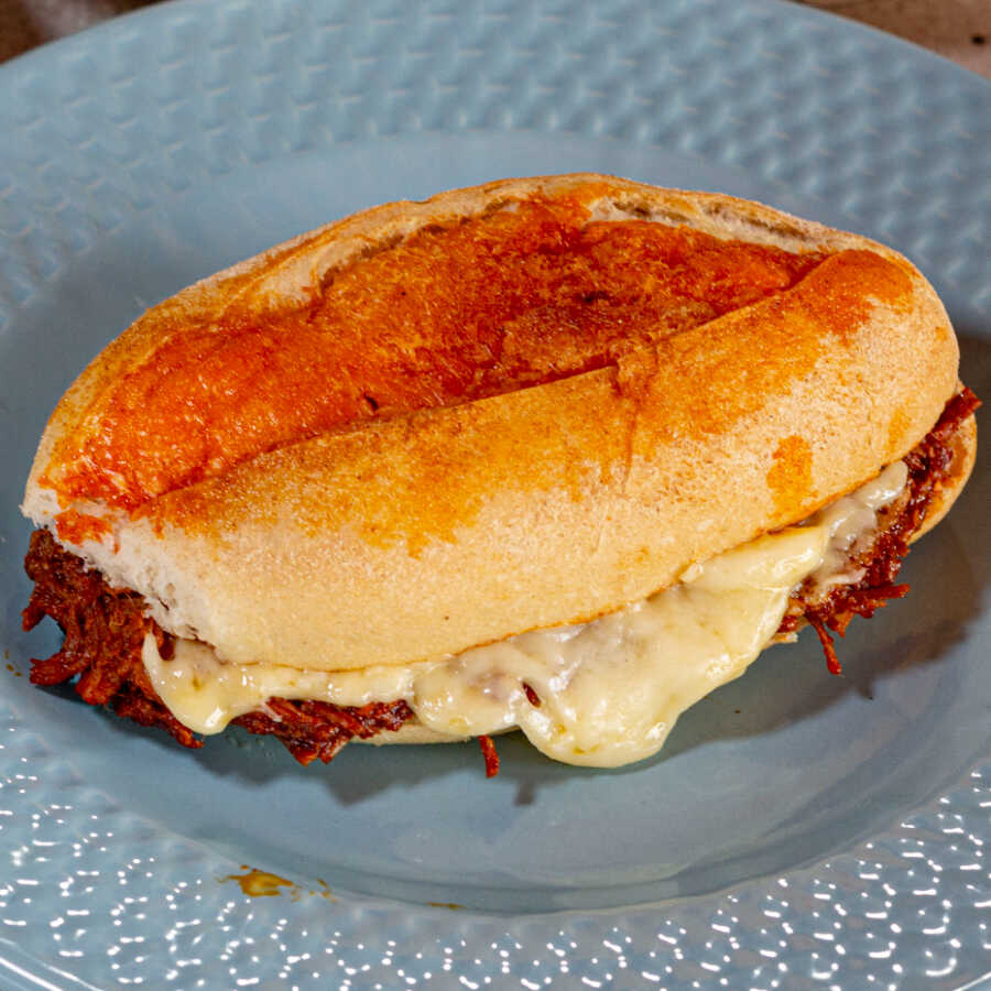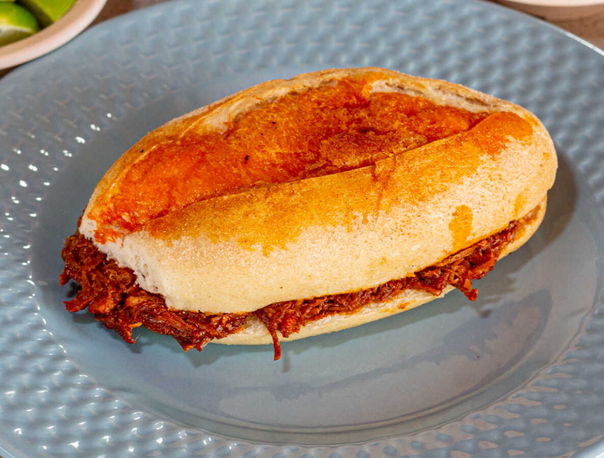 Deliciosa torta de birria estilo Jalisco en pan francés, incluye salsa roja, verde, limones.