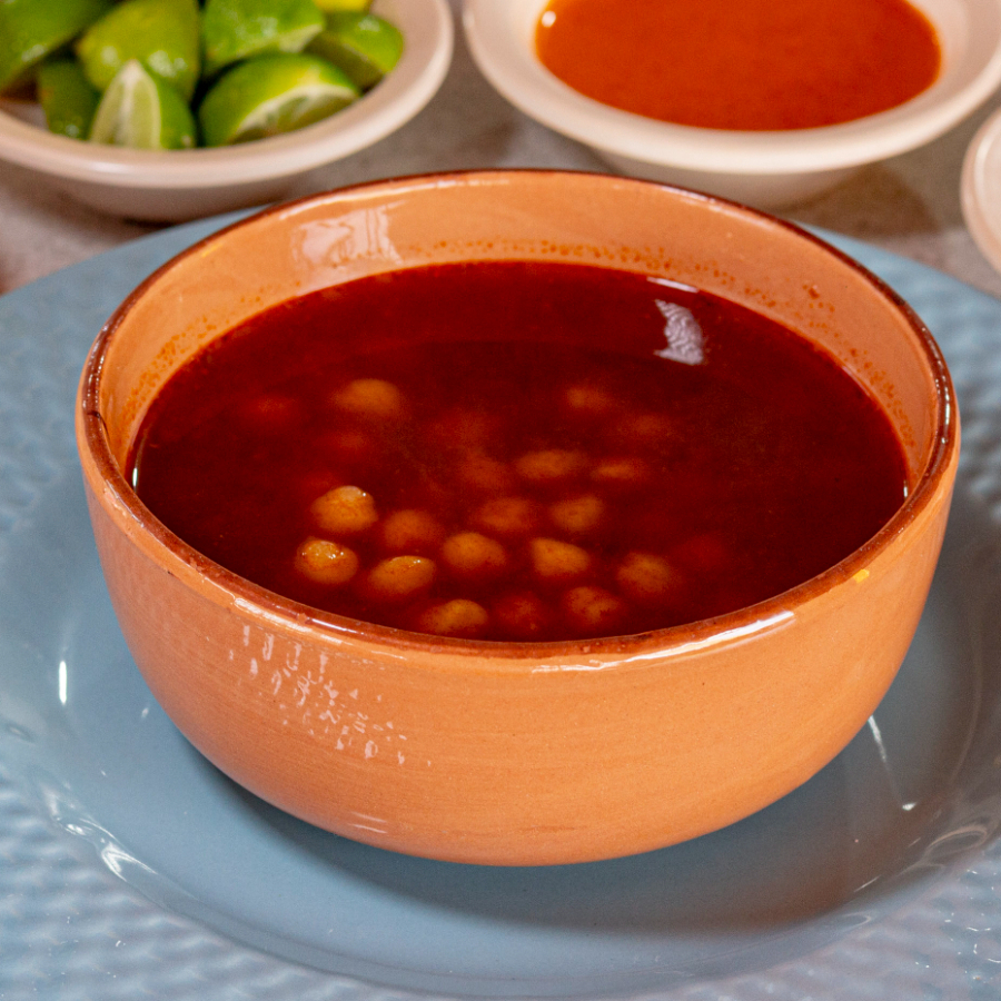 Delicioso consomé con la receta especial. Incluye verdura, salsa y limones.