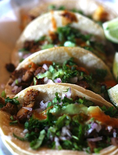 Delicioso Taco de chorizo acompañado de verduras, limones y salsas