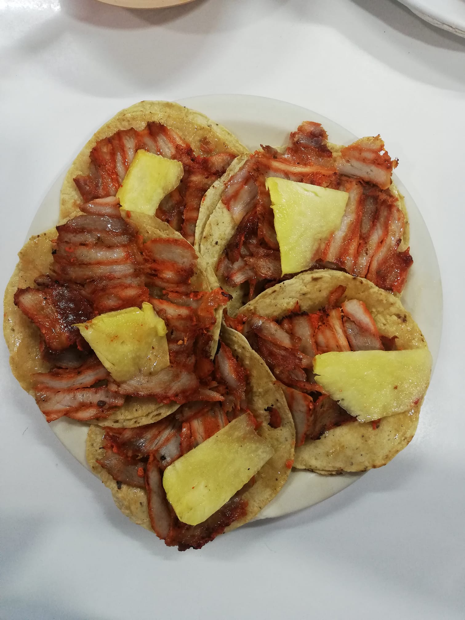 Delicioso Taco de carne al pastor, acompañado de verdura, limónes y salsas