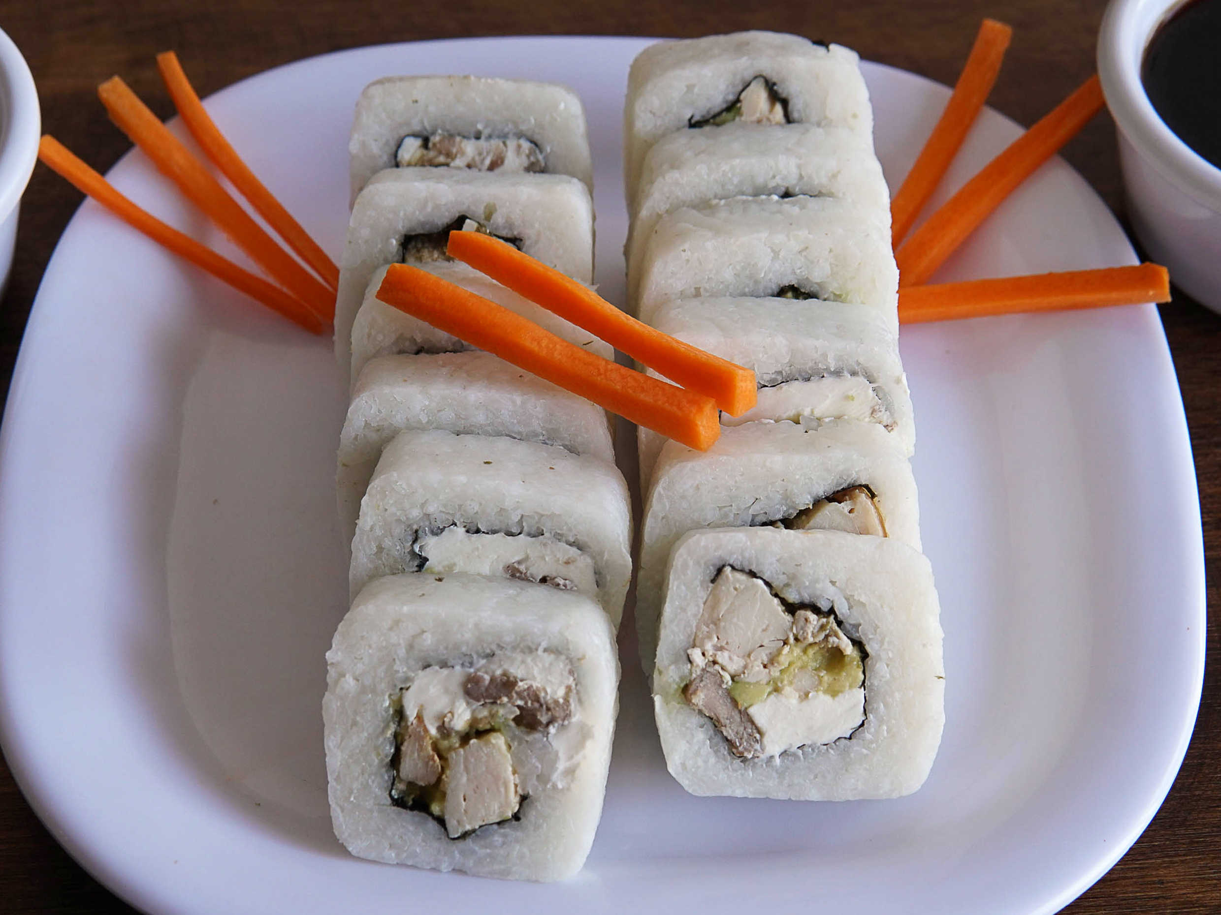 Exquisito arroz, alga, queso Philadelphia, aguacate, pepino, zanahoria, aderezo tampico y salsa de soya.