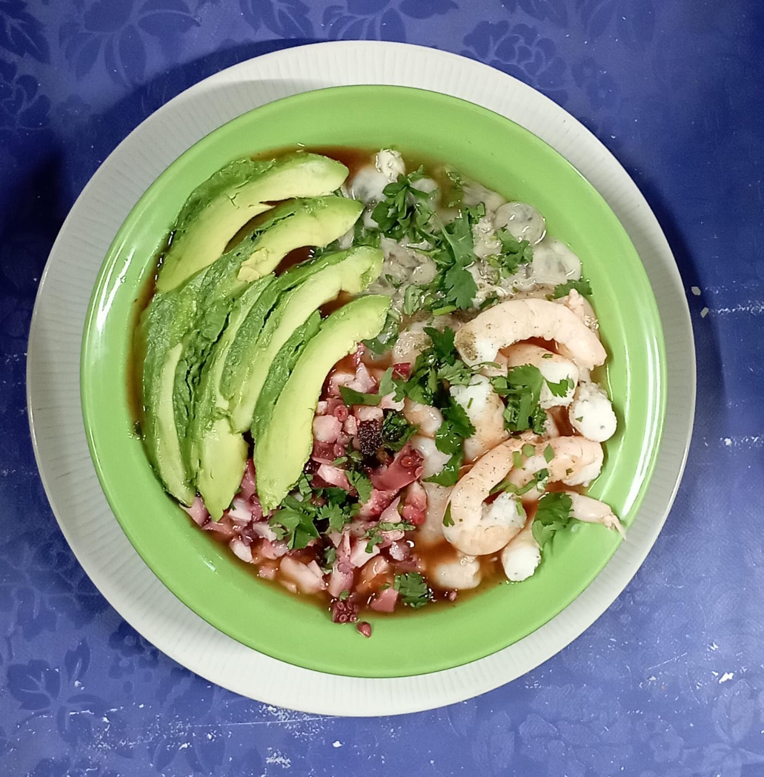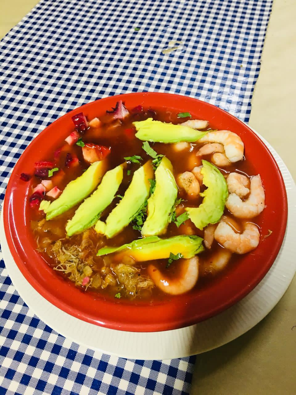 Salsa de tomate acompañado de chile serrano, cebolla, cilantro, limón, aguacate, ceviche, camarón, pulpo y ostión