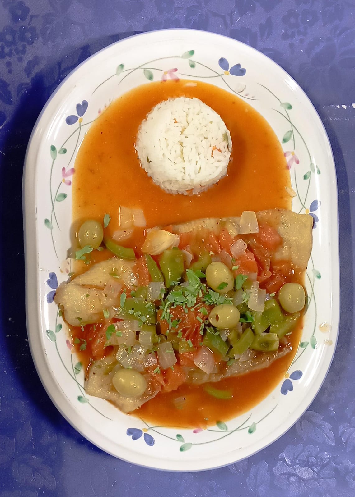 Filete de pescado preparado con salsa de tomate, perejil, chiles güeros y aceite de oliva
