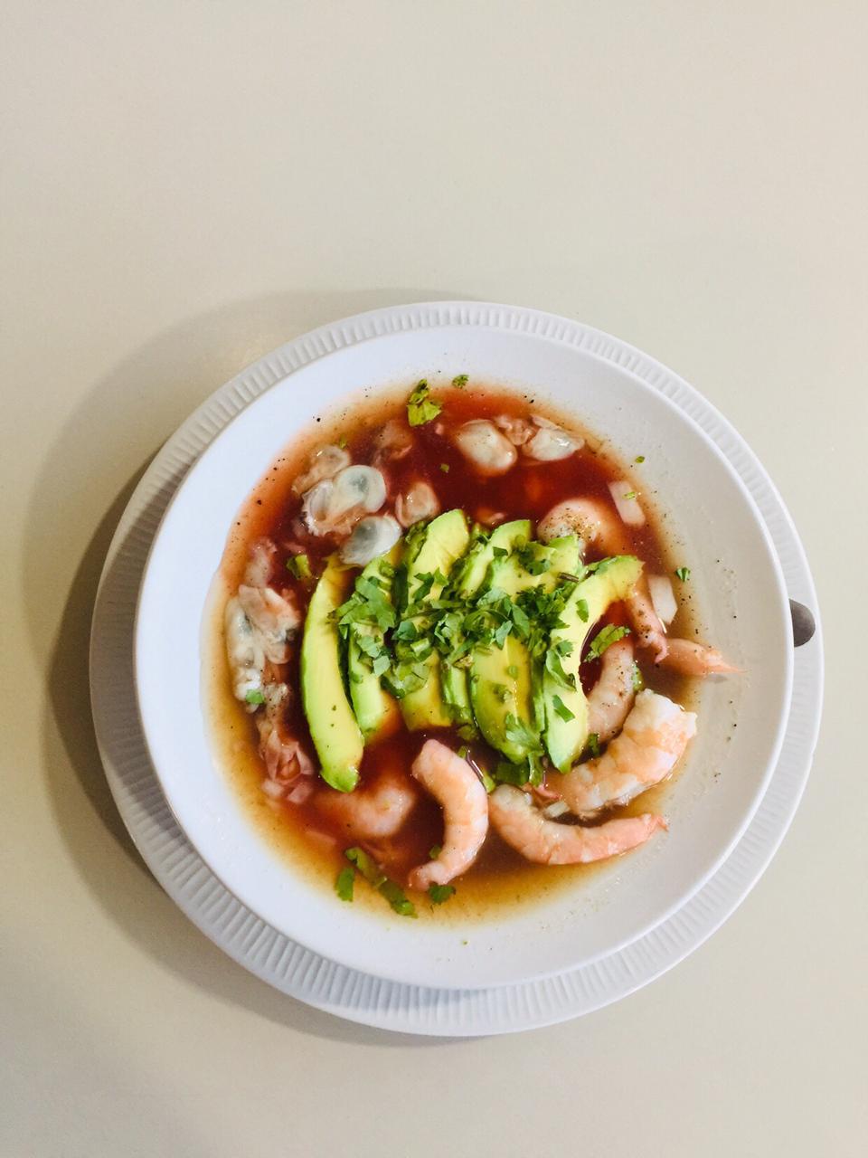 Salsa de tomate acompañado de camrones, jaiba y ostiones. Preparados con chile manzano, cebolla y aguacate