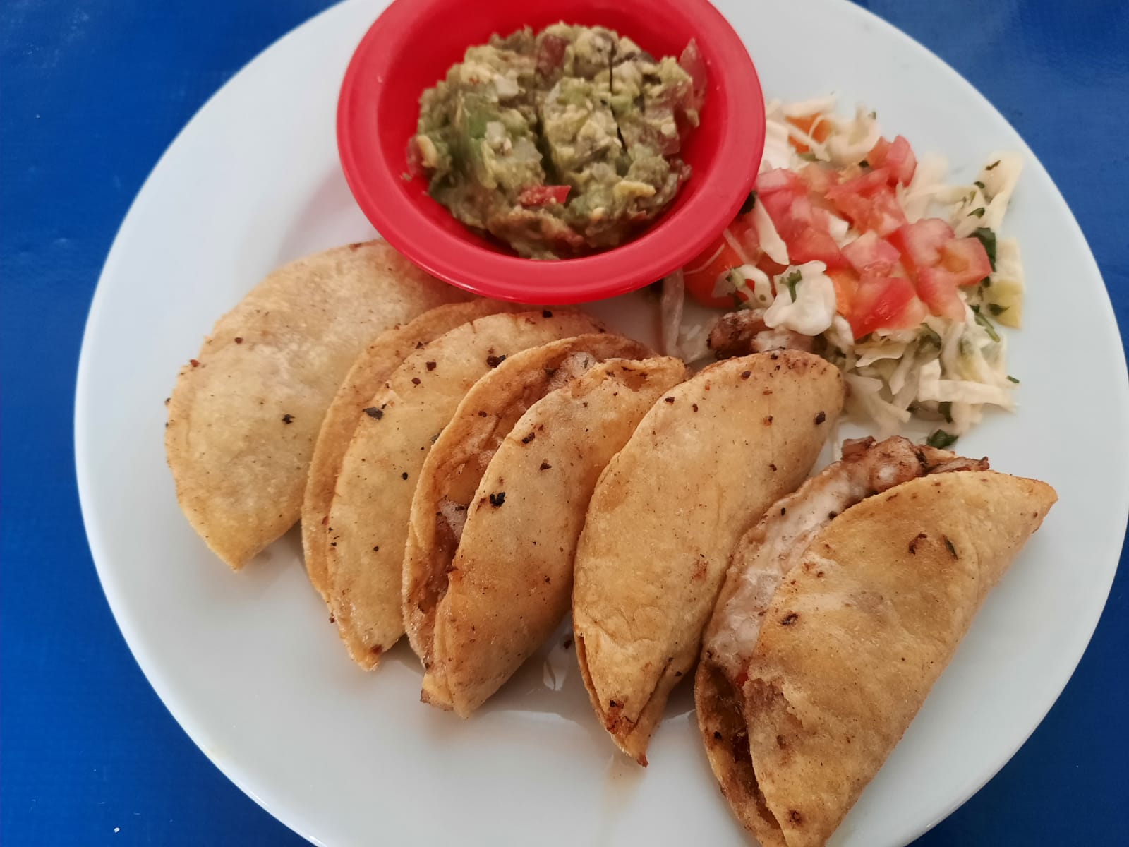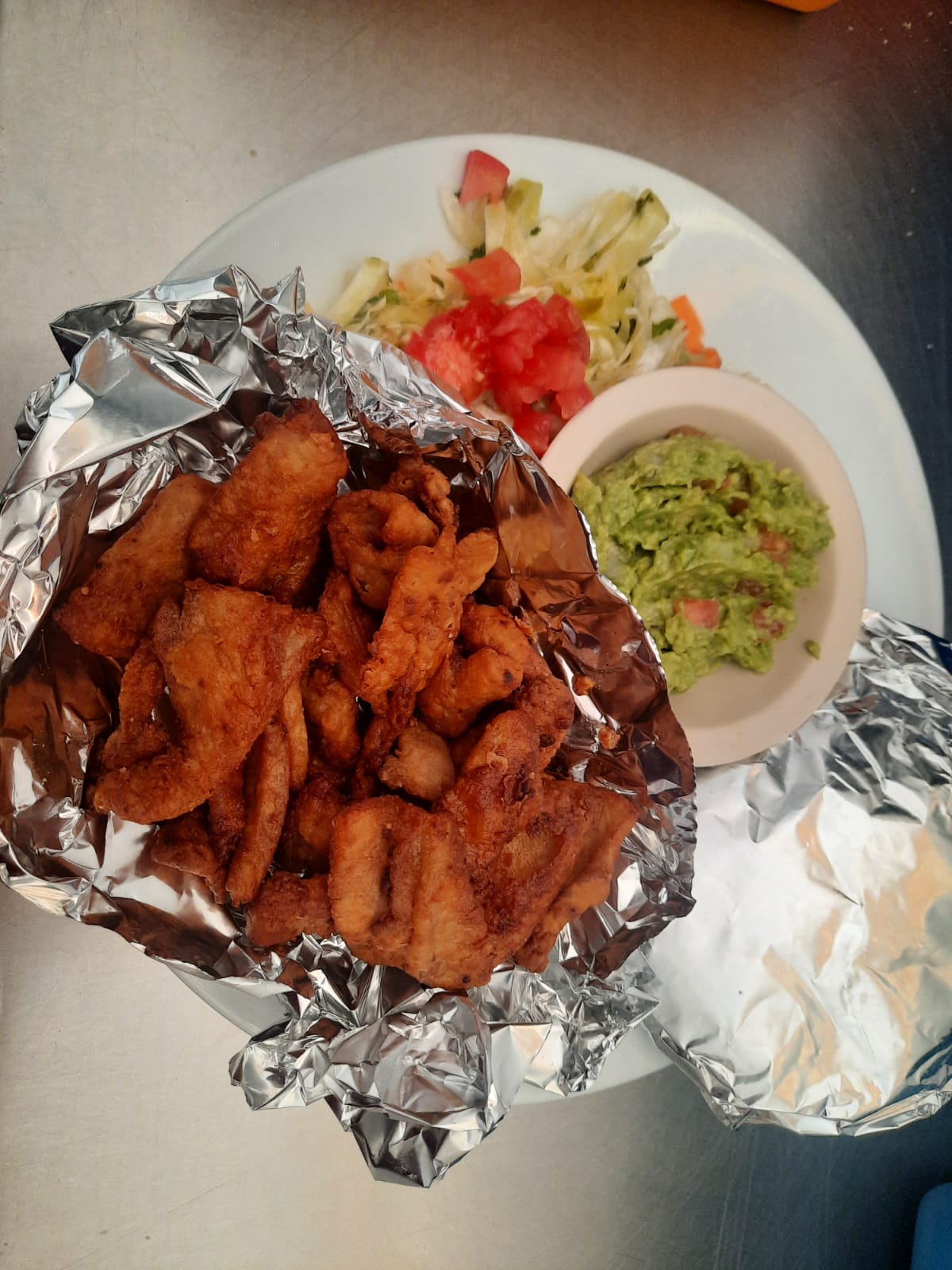 Crujiente chicharrón de pescado, servido con guacamole, ensalada y tortillas de maíz.