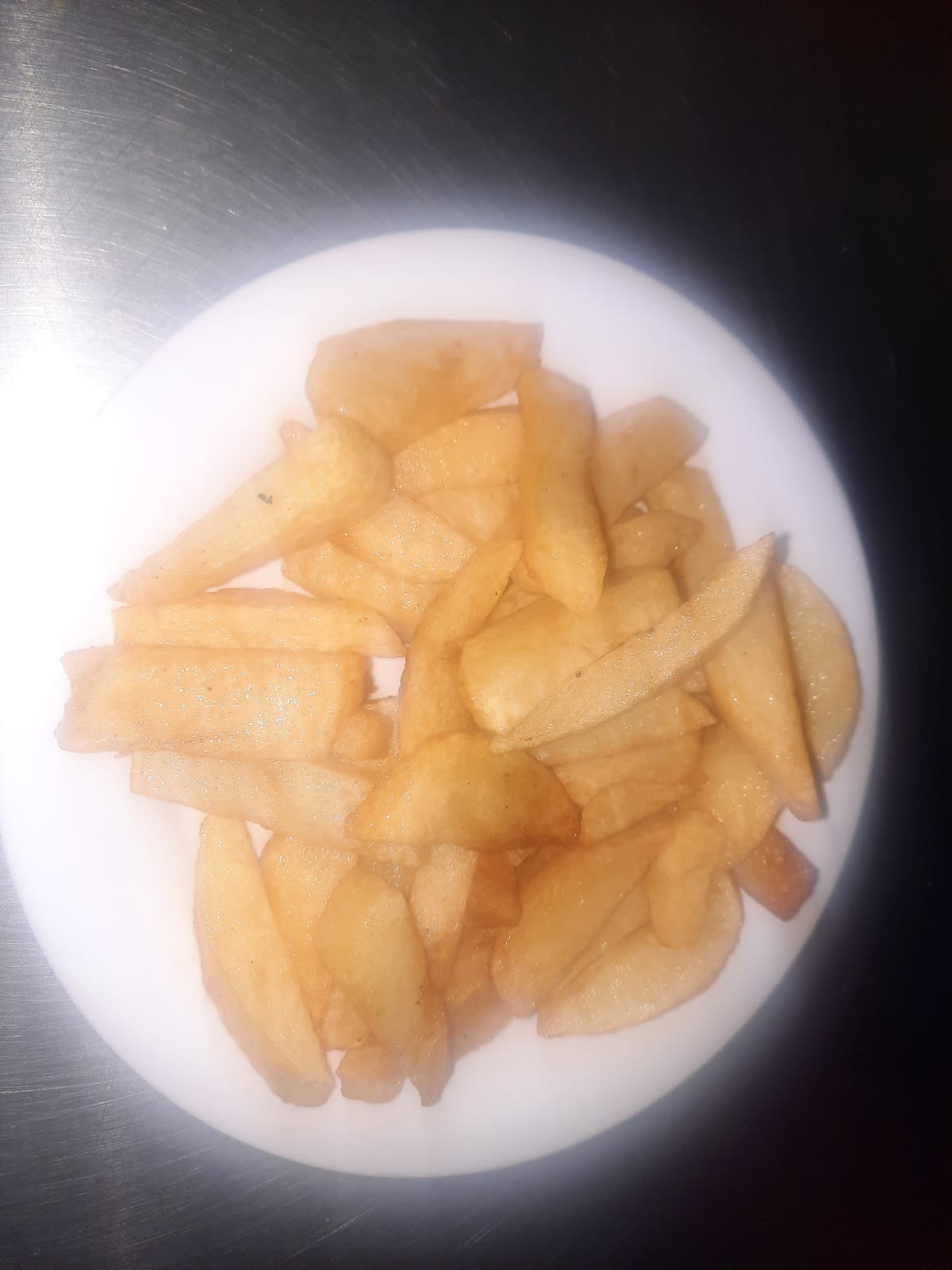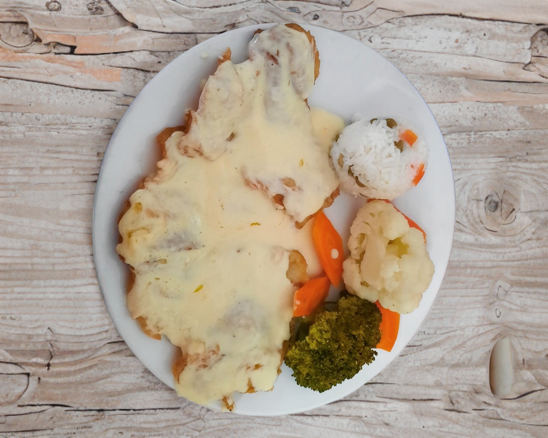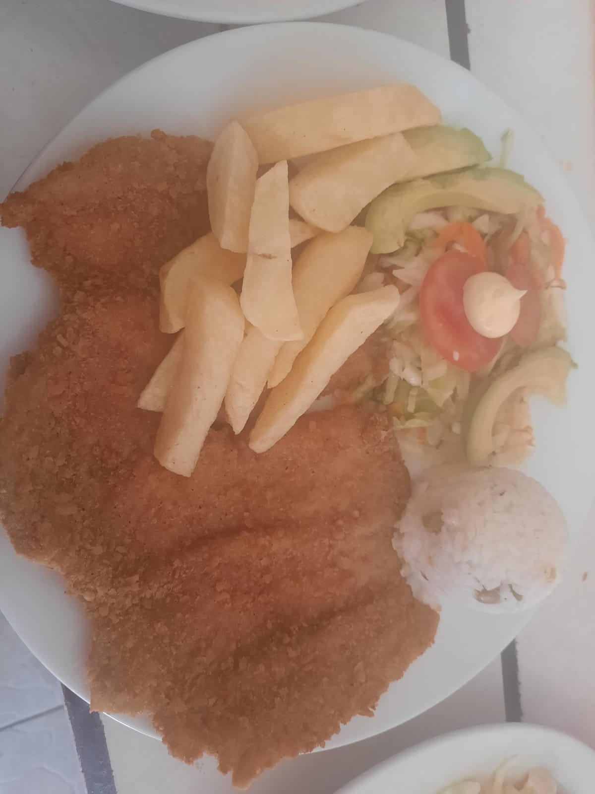 Filete capeado. Guarnición de arroz ensalada y papas.