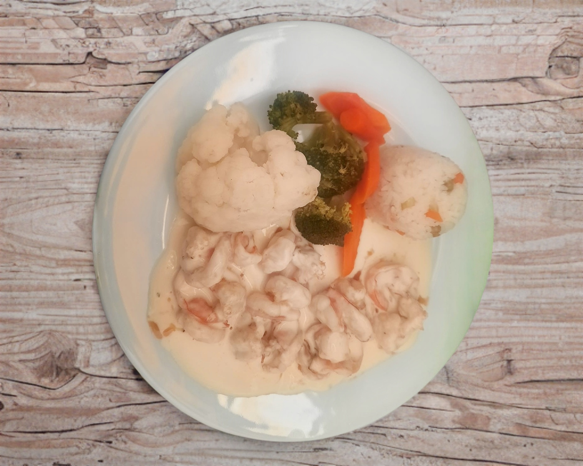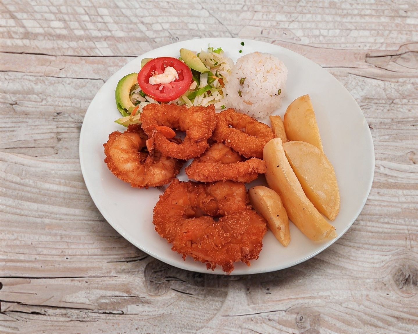 Camarones en pasta de ajo, acompañados de ensalada de repollo y arroz.