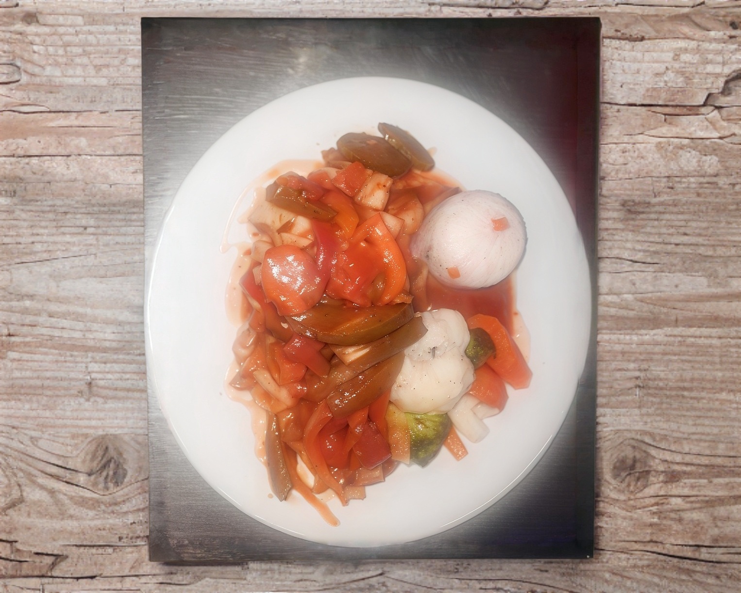 Relleno de camarón y pulpo envuelto en tocino. Servido con arroz y verduras.