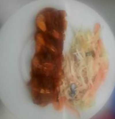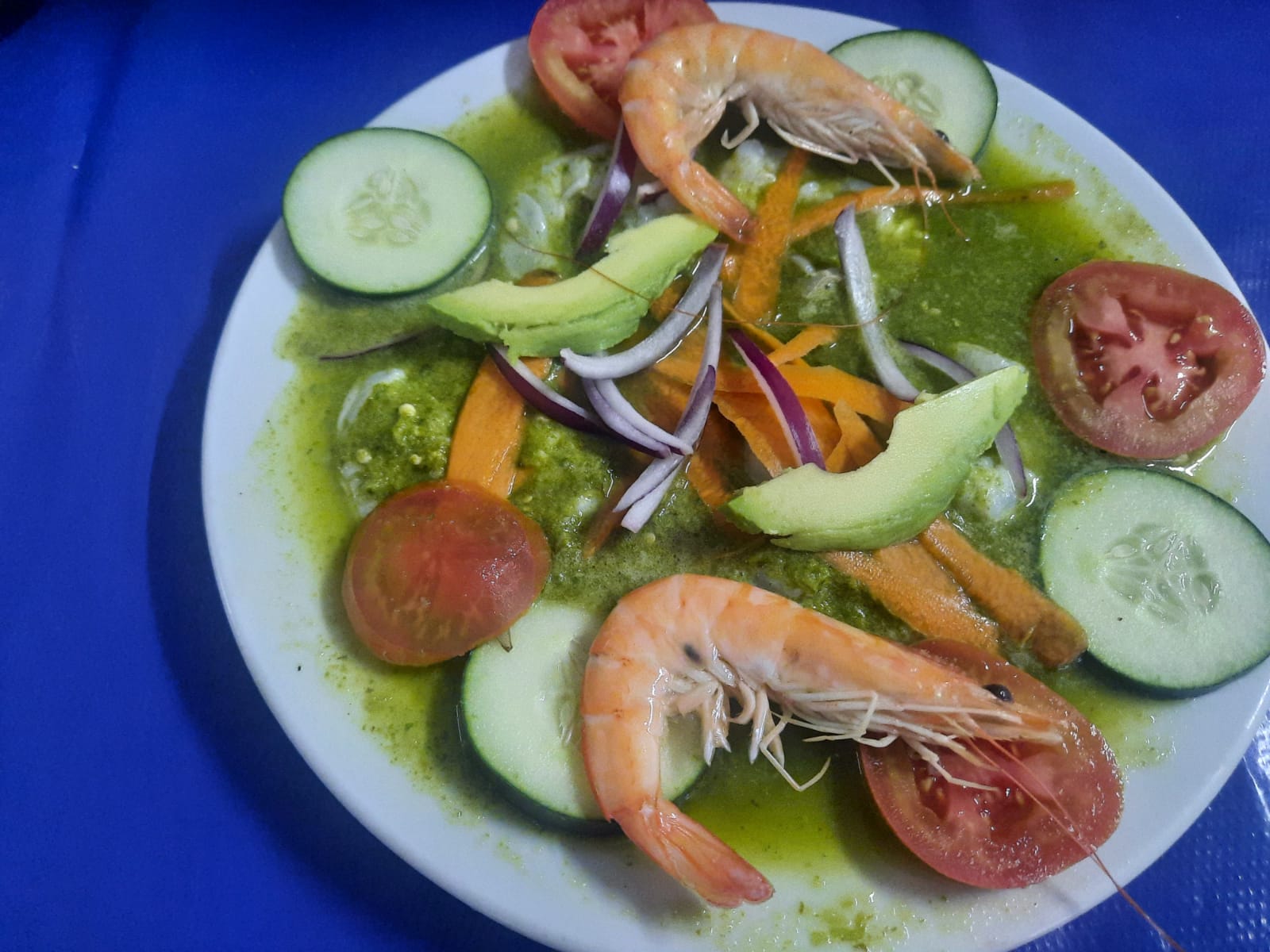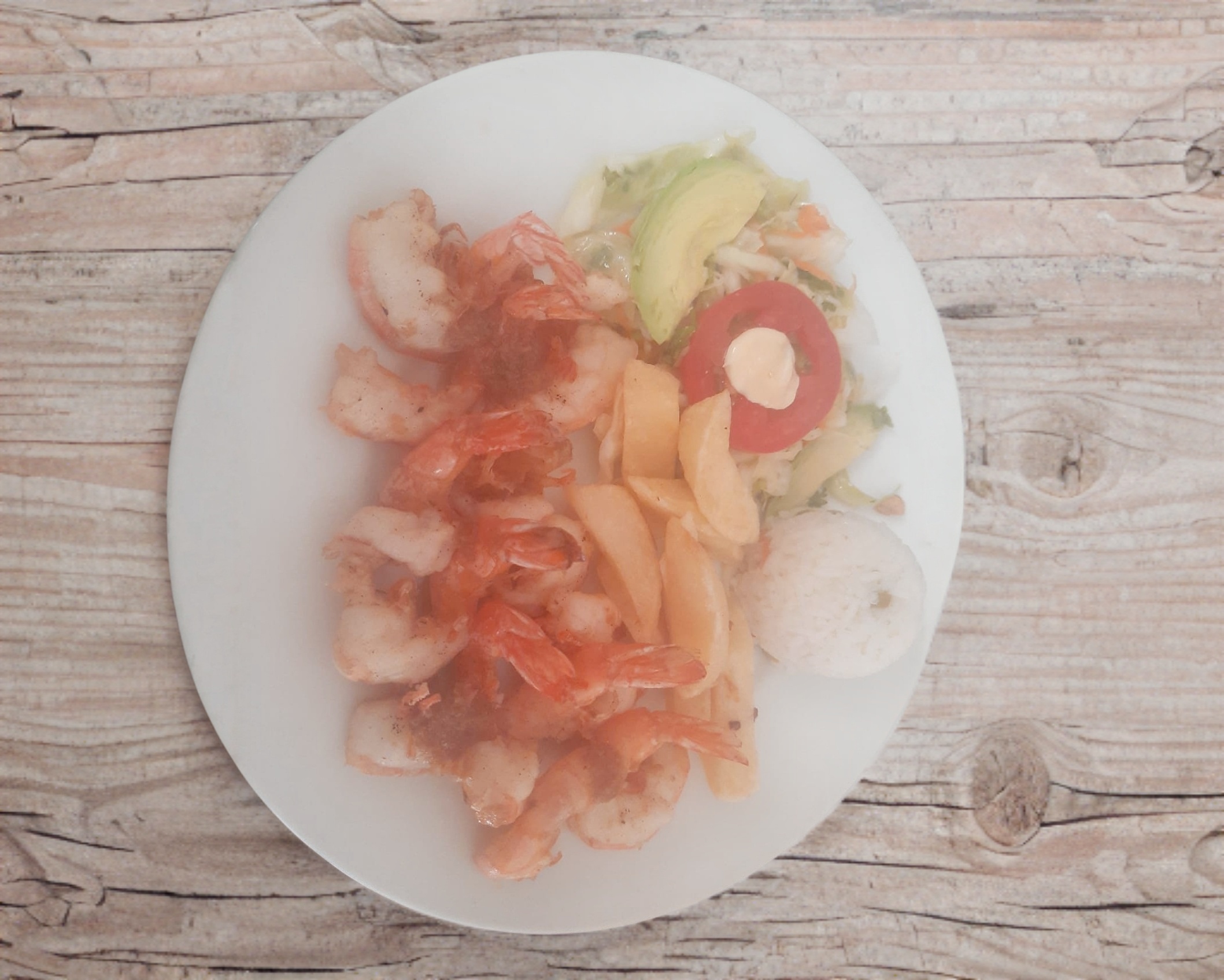 Camarones con ajo en trozos y chile cascabel, acompañados de ensalada de repollo, papas y arroz.