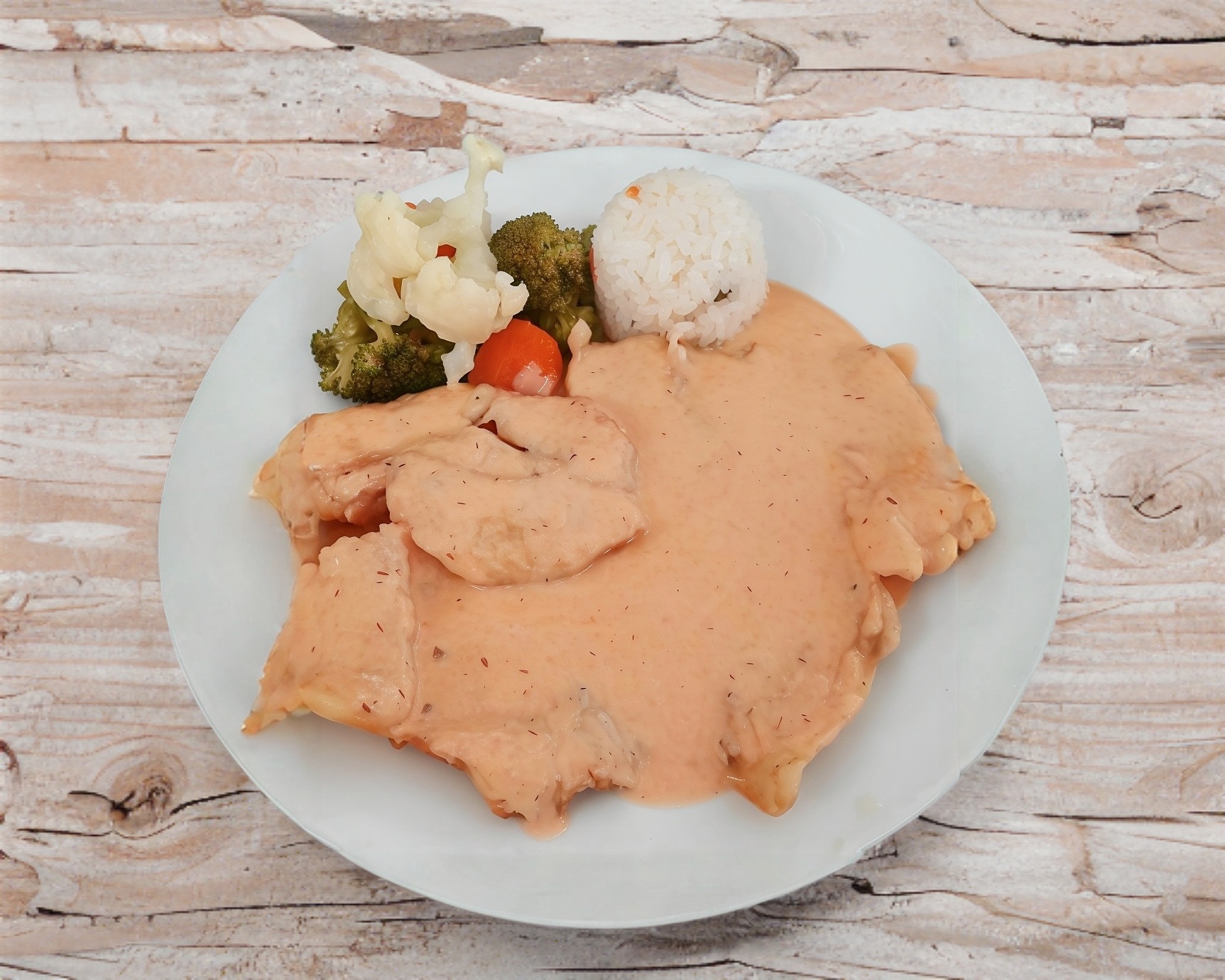 Preparados en crema de chipotle y guarnición de arroz y verduras.