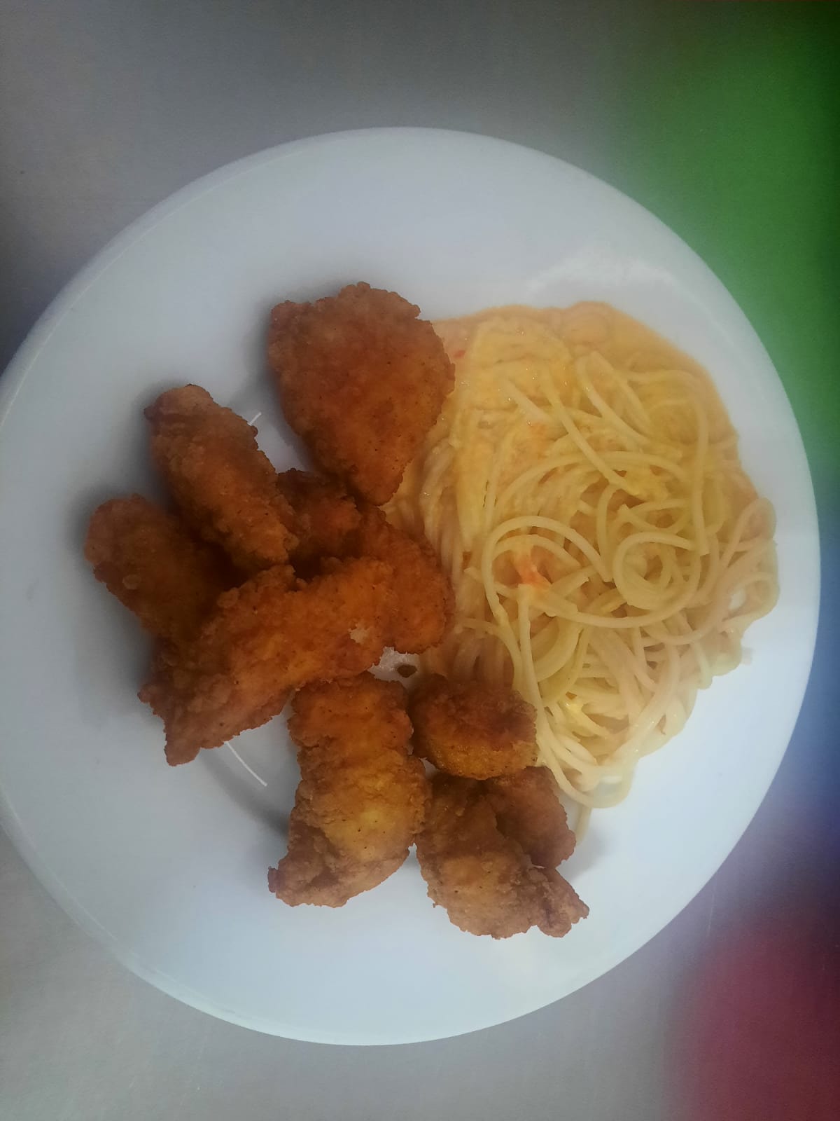 Pechuga de pollo empanizada con guarnición de spaghetti.