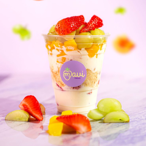Fresas, duraznos y uvas juntas en una mezcla explosiva de sabor, cubiertas con una crema suave y deliciosa que lo hace todo más irresistible.