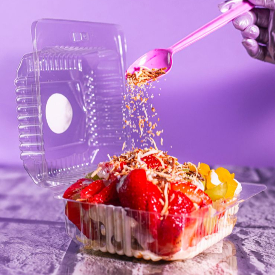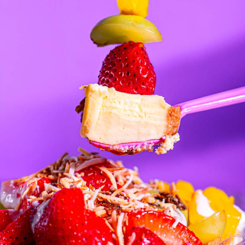 Una rebanada cremosa que se derrite en tu boca, acompañada de la fruta que tu elijas: fresa, durazno y uva. Añade tus toppings favoritos y llévalo al siguiente nivel