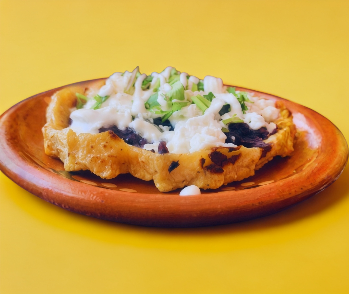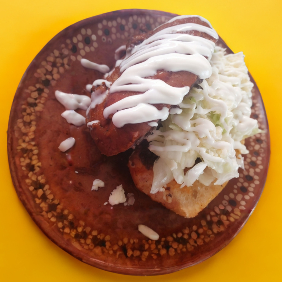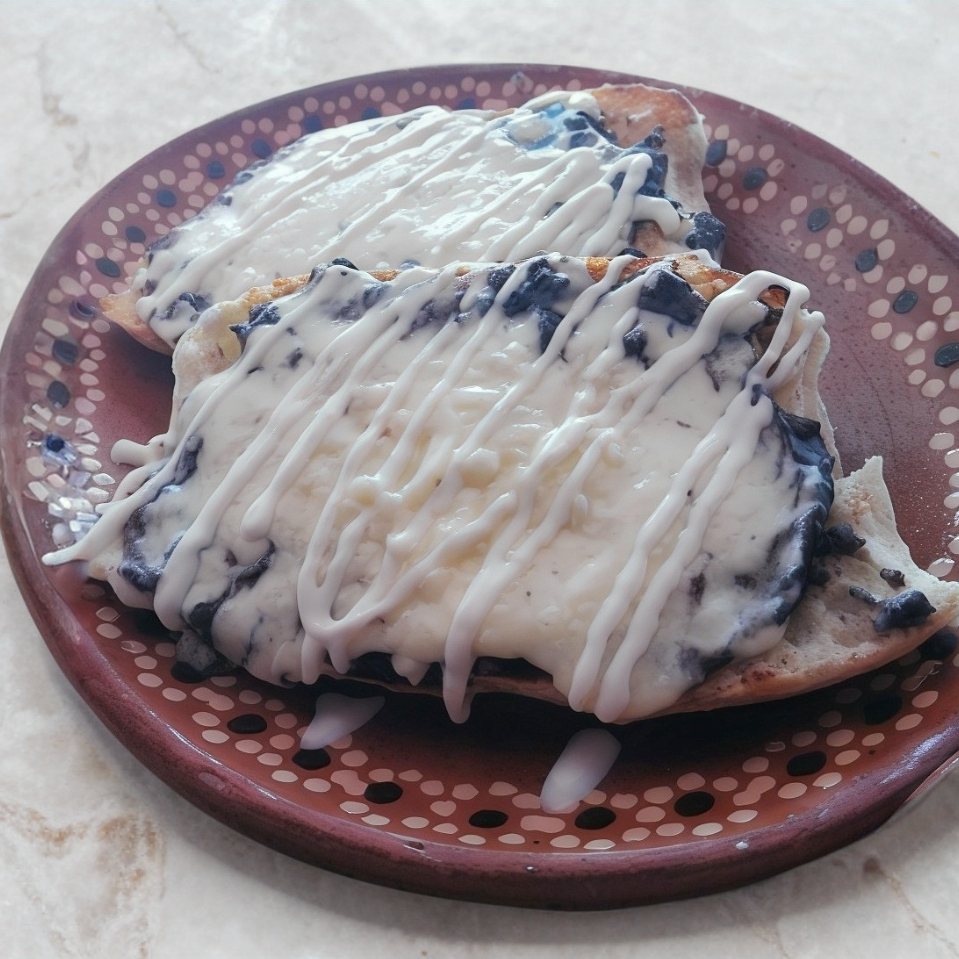 tortilla gruesa de aprox 15 cm de largo, rellena de frijoles, queso, lechuga y crema