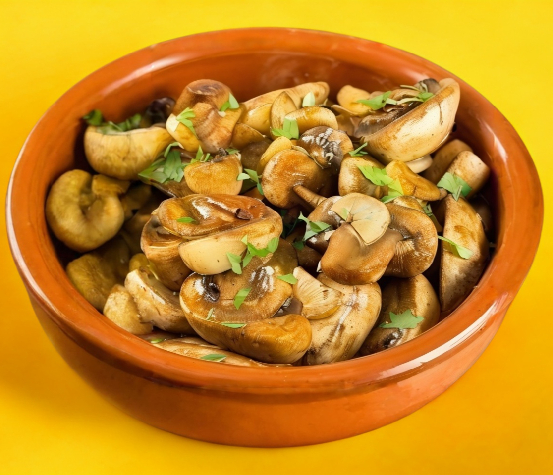 250 grs de champiñones, ajo, perejil, salsas negras y un toque de guajillo picado