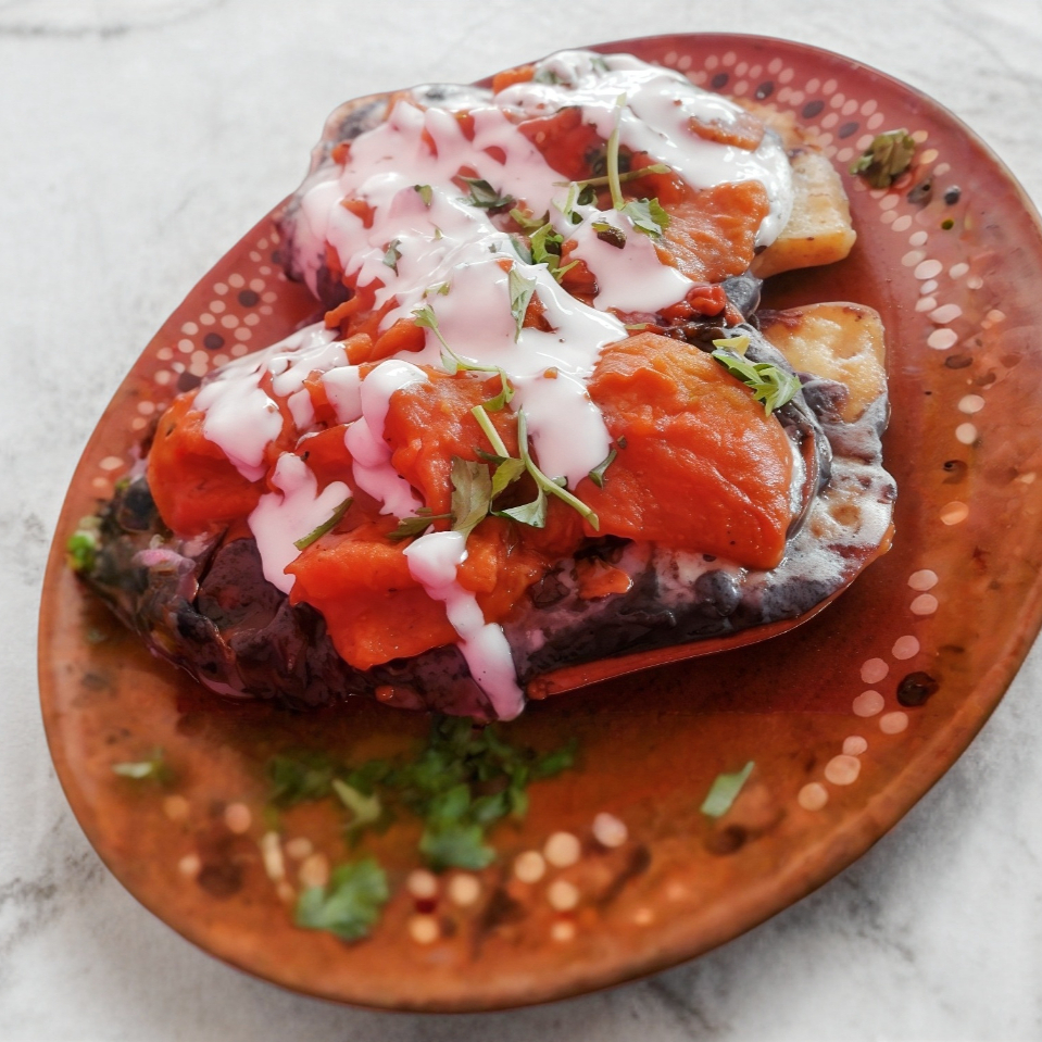 Totopos bañados en salsa de su preferencia acompañdos de frijolitos negros y arrachera